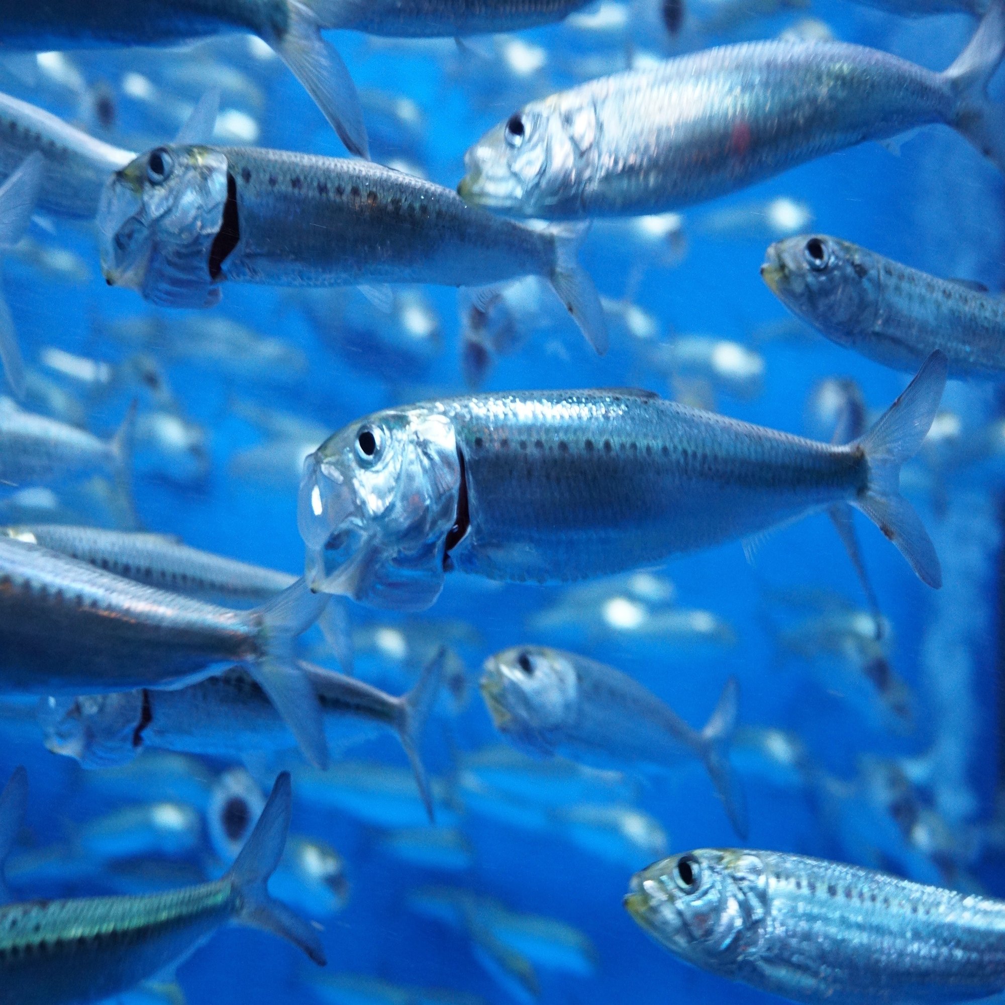 マイワシが口と鰓を開いて、餌を海水からろ過しようとしながら泳いでいます。この姿はまた後の内容と関係があります。