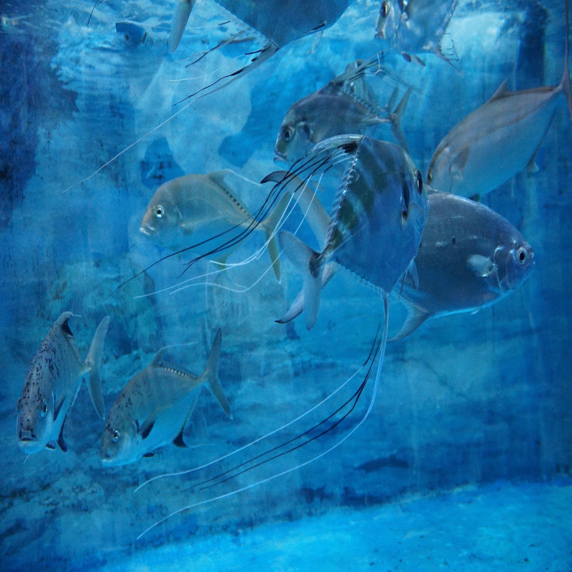 イトヒキアジが長い鰭条をたなびかせています。飼育技術の高さをうかがわせます。