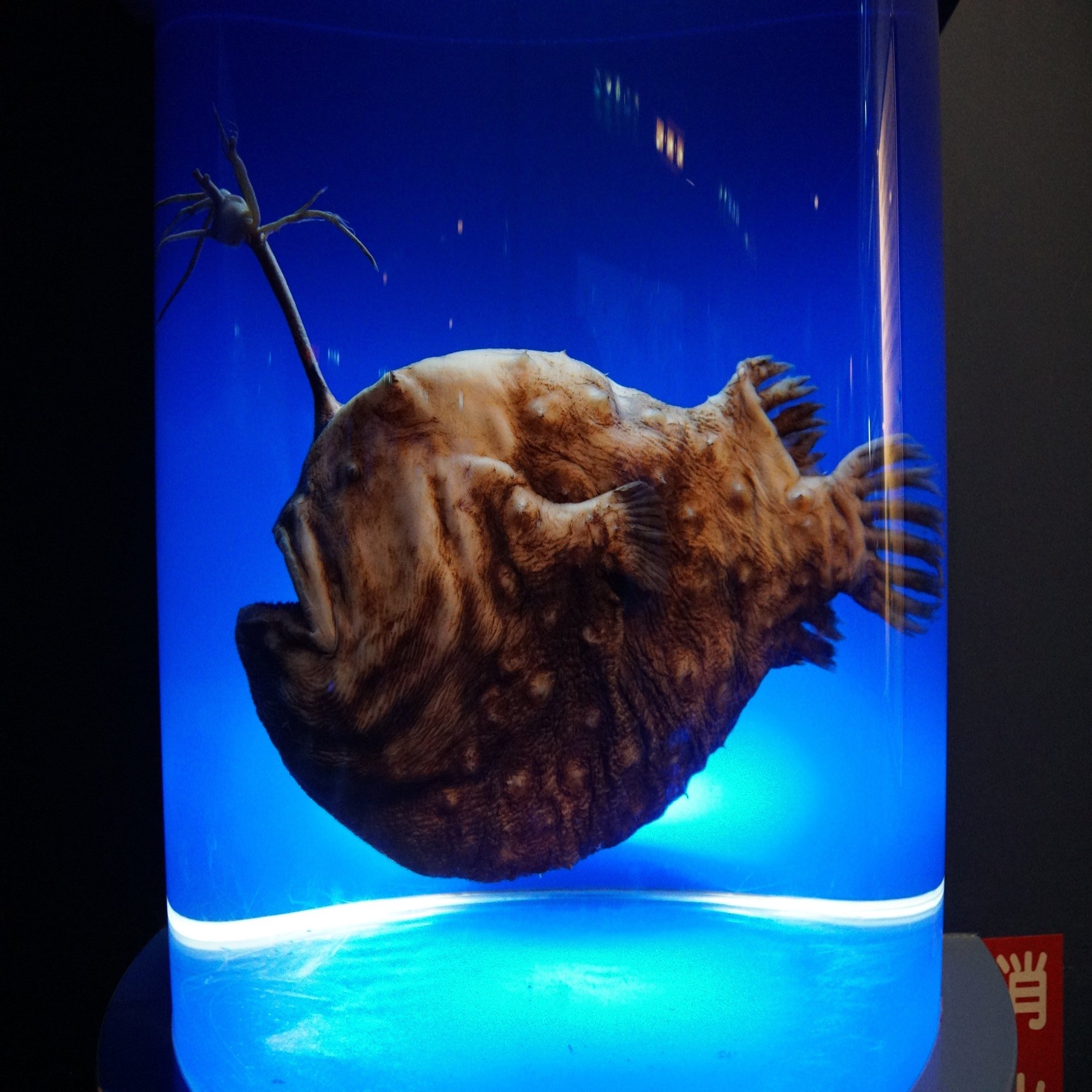 さて、汽車窓式水槽の対面に現れるのがこの大きなチョウチンアンコウと……、