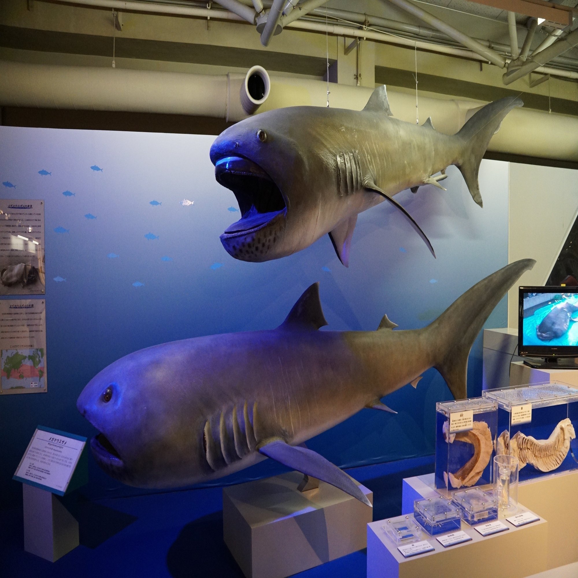 奇しくも閉館となった油壺と同じく、閉鎖されるこちらのフロアにメガマウスザメの剥製がありました。海は繋がっている……。