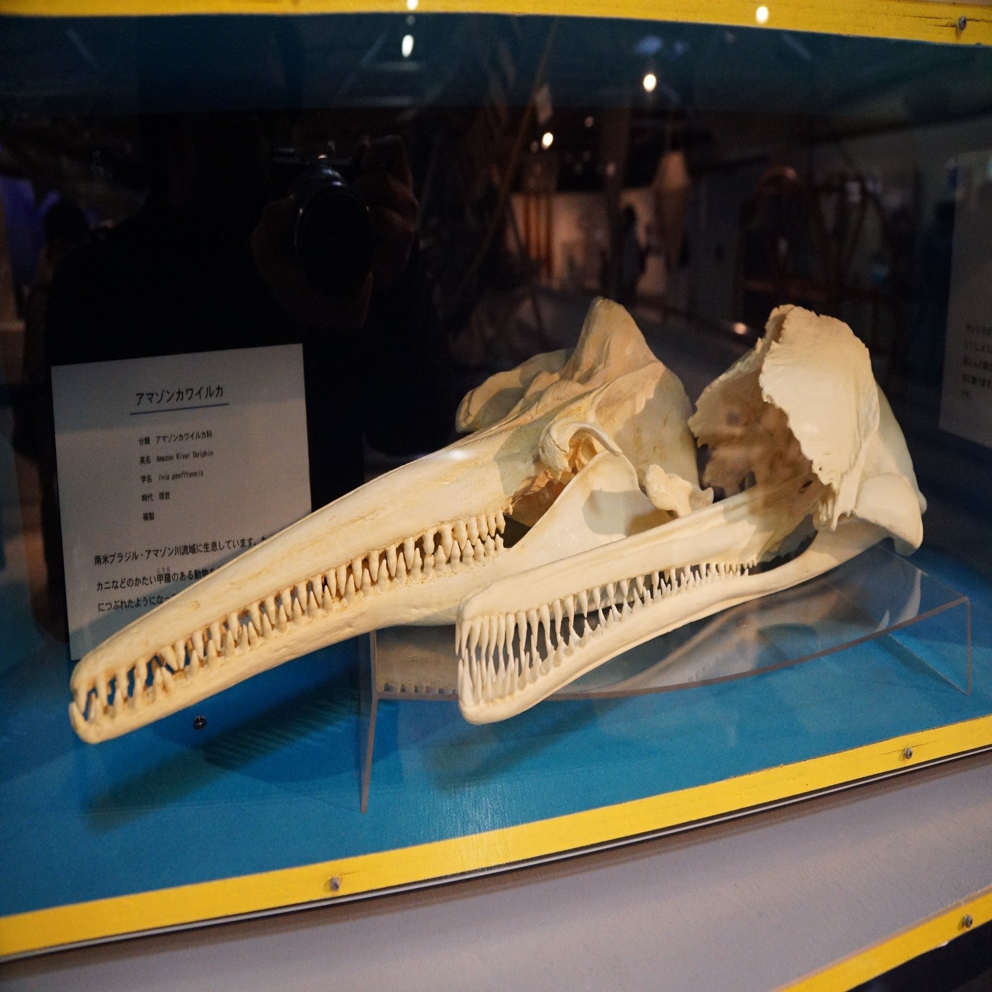 なかでもアマゾンカワイルカとガンジスカワイルカの頭骨は特に珍しいものでした。顎が鳥のクチバシのように細長かったり、歯の形が顎の先と奥で違ったり、ガンジスカワイルカにはフードのような骨があったりと、珍しい特徴が見て取れます。
