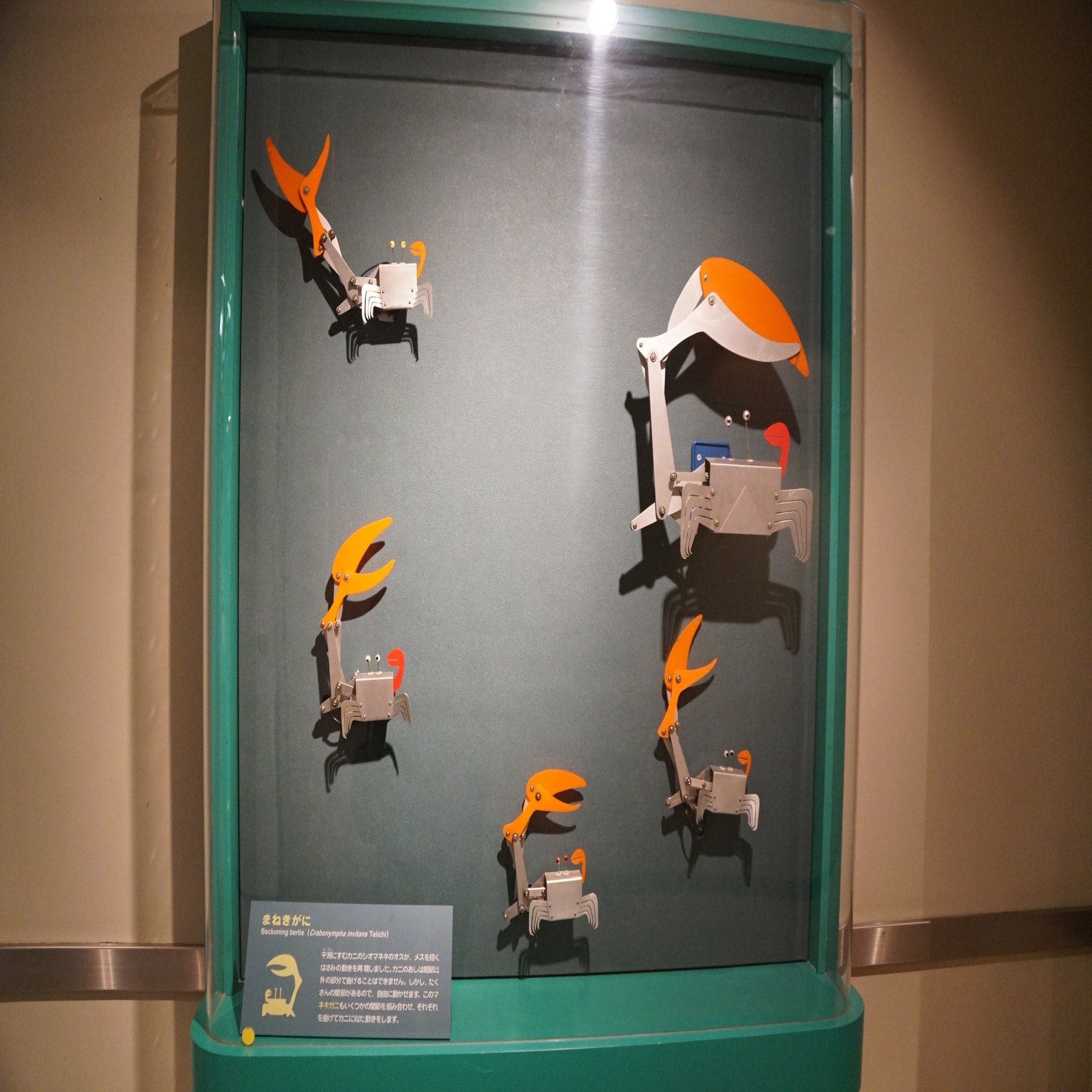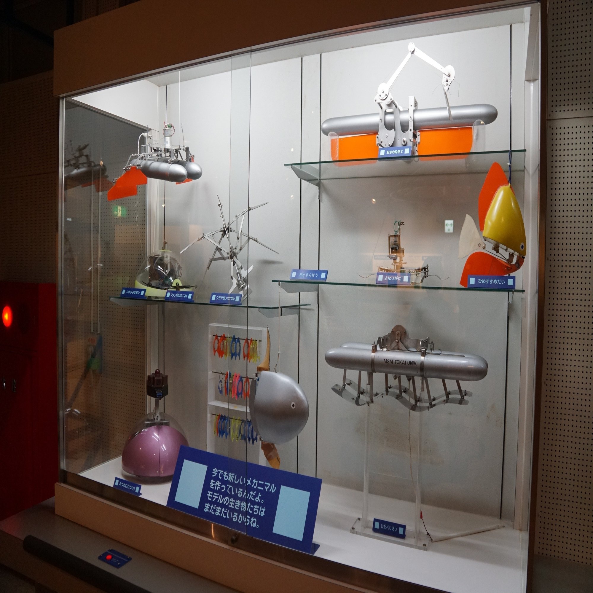 この展示室は「メクアリウム」、海の生き物が動き回る原理を取り入れた動物型ロボット「メカニマル」の水族館です。