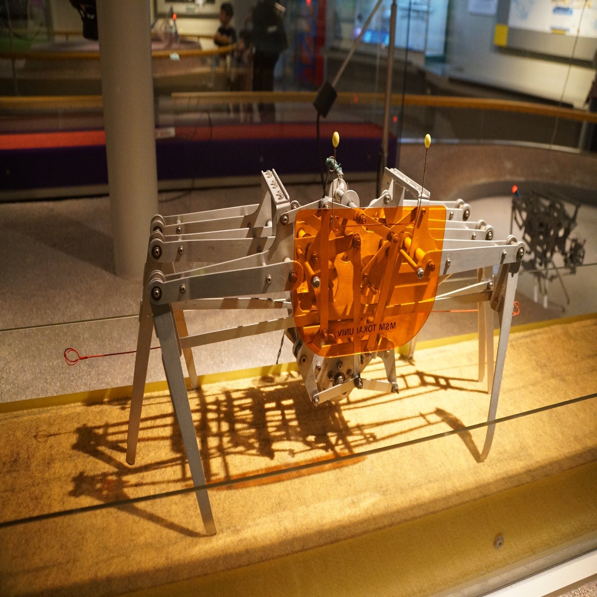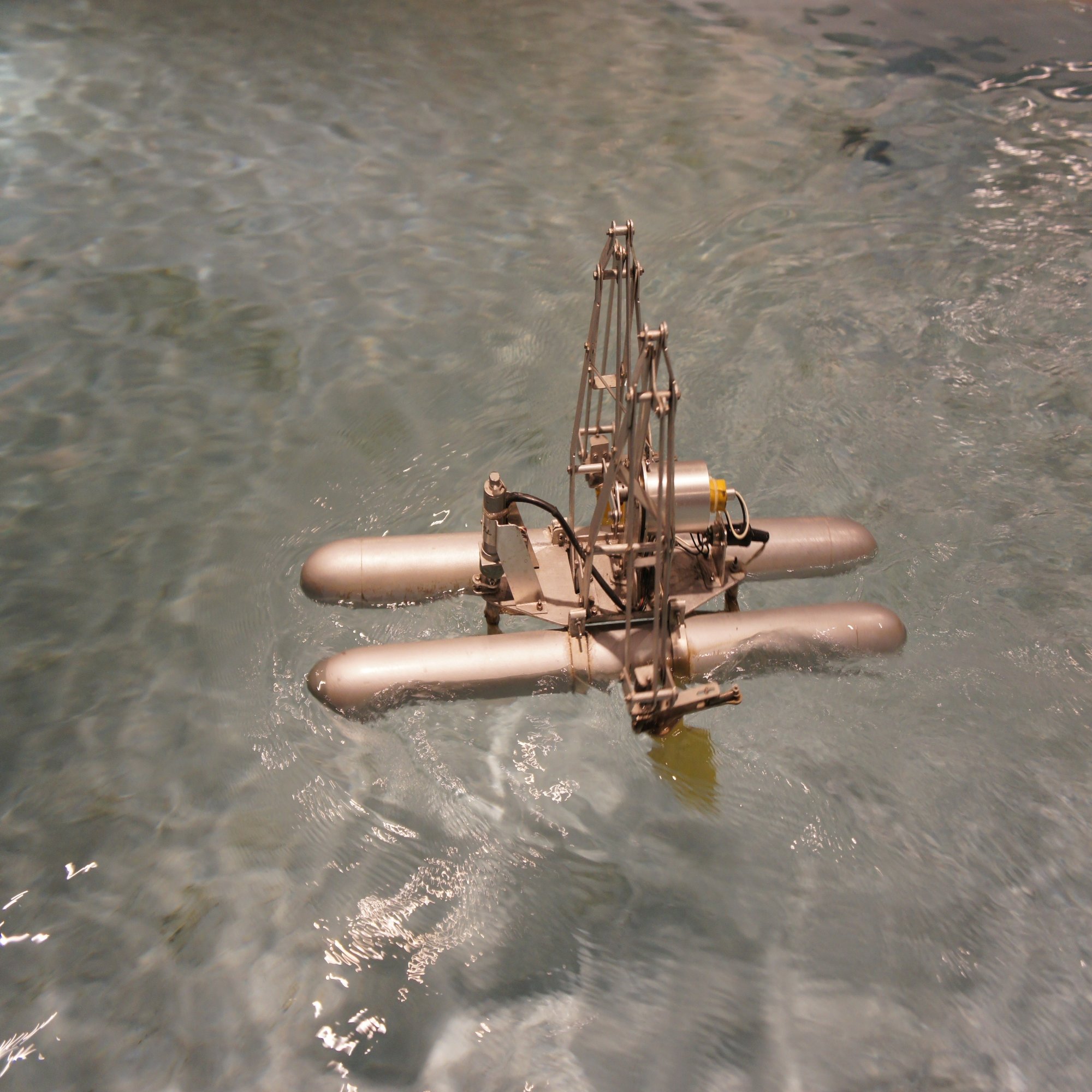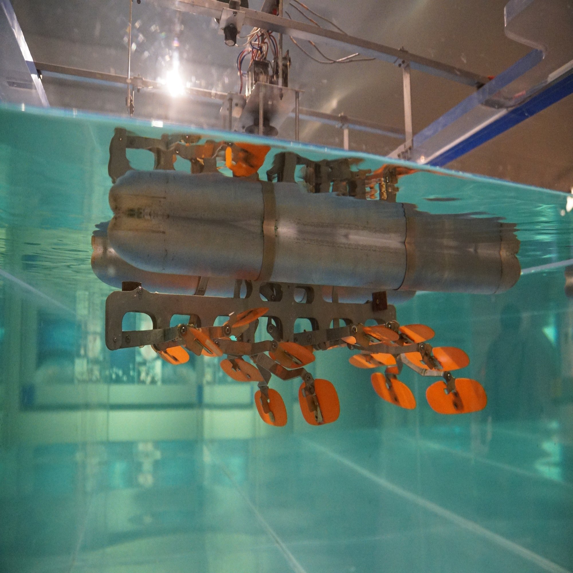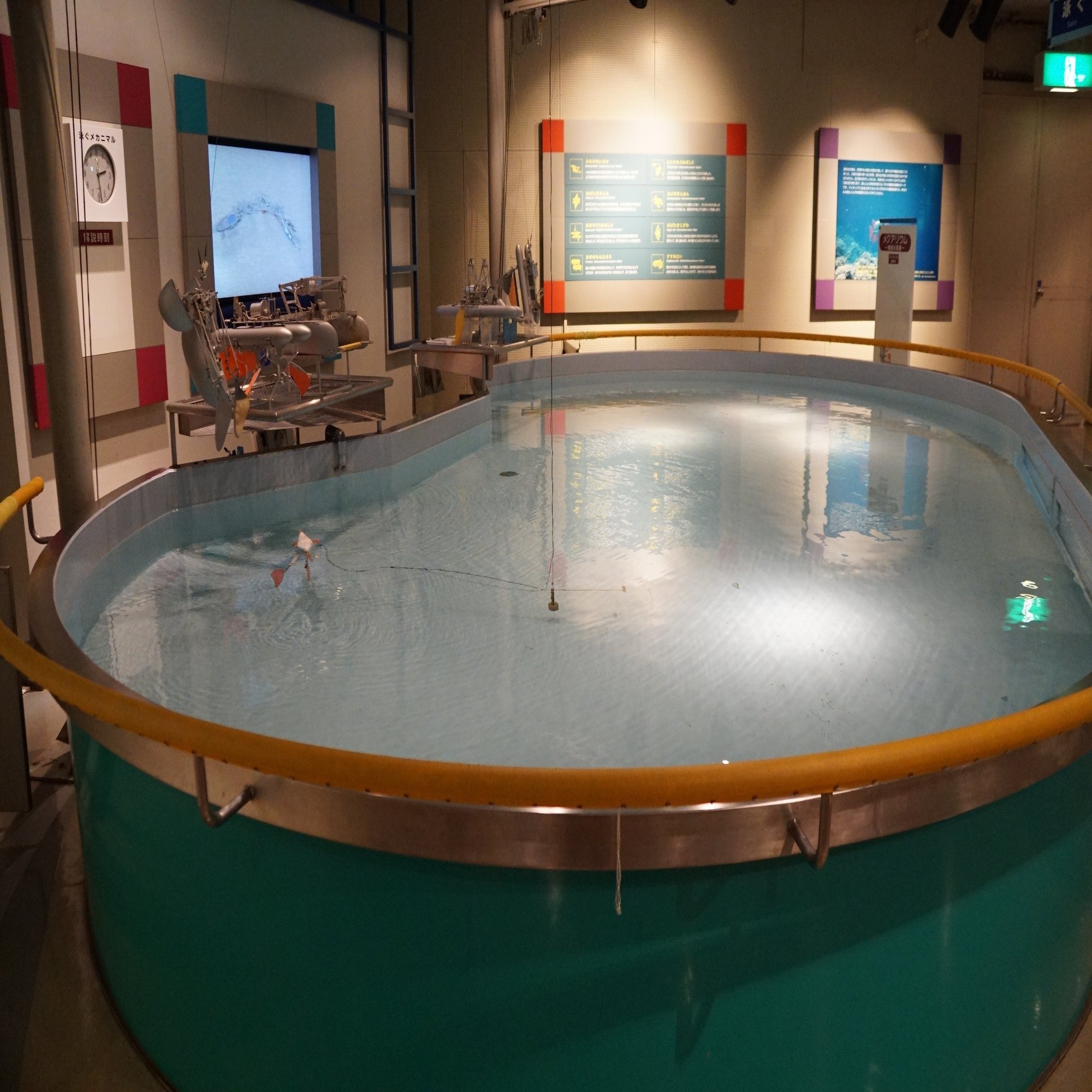 せっかくなので往時の雄姿を。これは「オオウデウミバシリ」、あまりそうは見えませんがマグロの尾鰭を元にしたメカニマルです。水面下にマグロの尾鰭を半分にしたようなパドルが見えるでしょうか。これをアームの動きで左右に振ることでマグロの尾鰭と同じように水を切って進むのです。