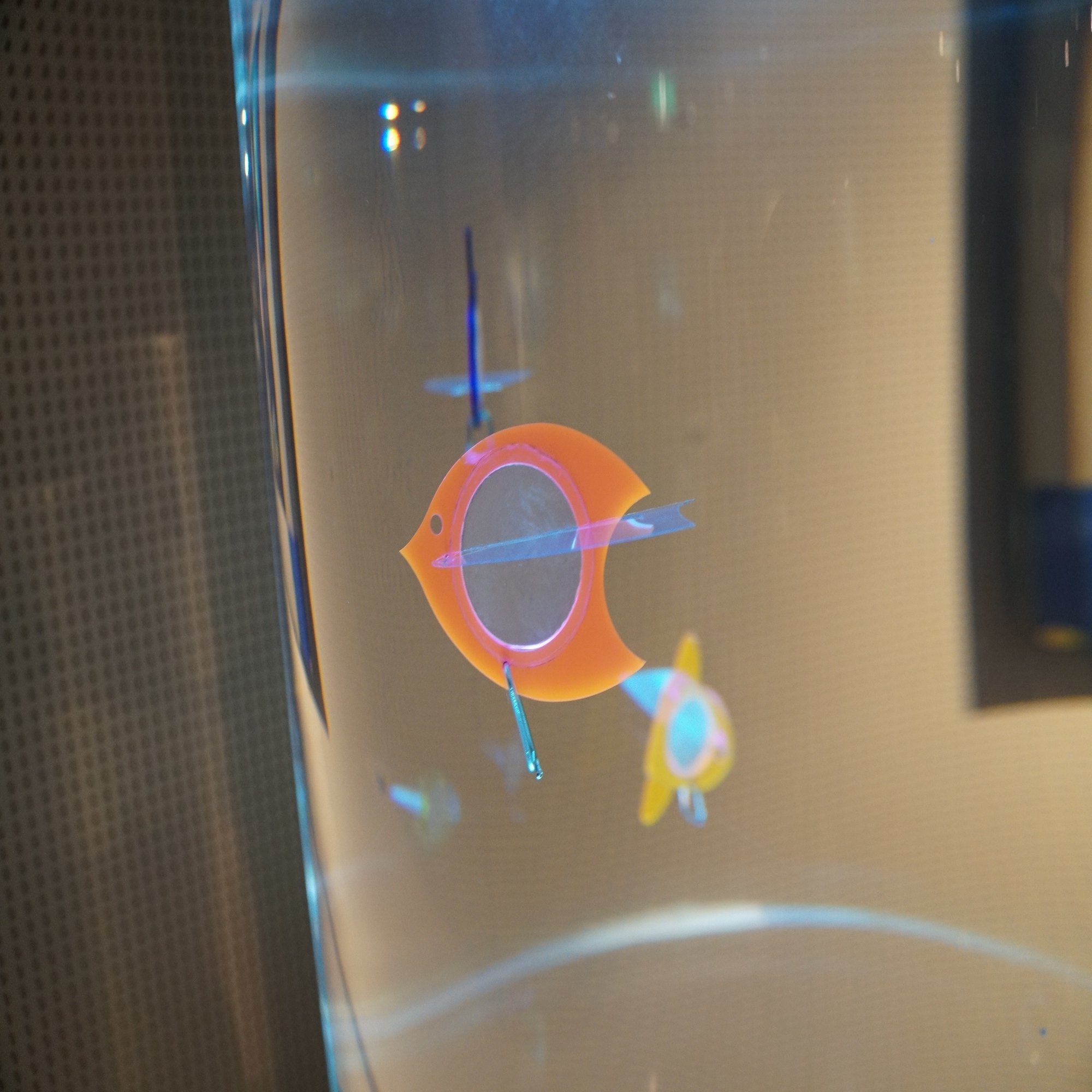 いっぽうではこんな一見シンプルなものも。「フウライスカシウオ」は水圧の変化で浮袋が伸び縮みして浮き沈みするという原理と、それにより水流を受けて鰭の向きが変わり水流から前進する力を得るという原理を組み合わせています。完全にこのような動きをする生き物がいるわけではないですが、動きの原理の研究の成果です。
