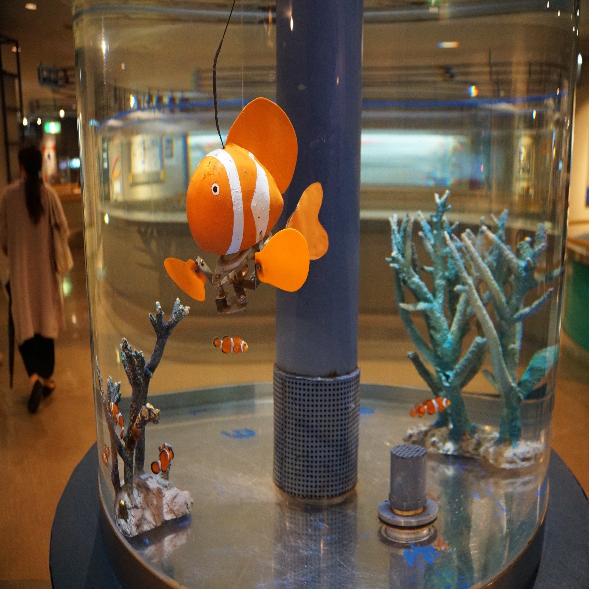 リンク機構により胸鰭と尾鰭を連動させる「パタヒレクマノミ」とカクレクマノミが共存しています。カクレクマノミは驚く様子も見せません。メクアリウムの設立当初、メカニマルは自然と調和する理想的な海洋機械と考えられていたようで、この水槽はただ比較するだけでなく、そういう理想を体現するものとして作られたのかもしれません。