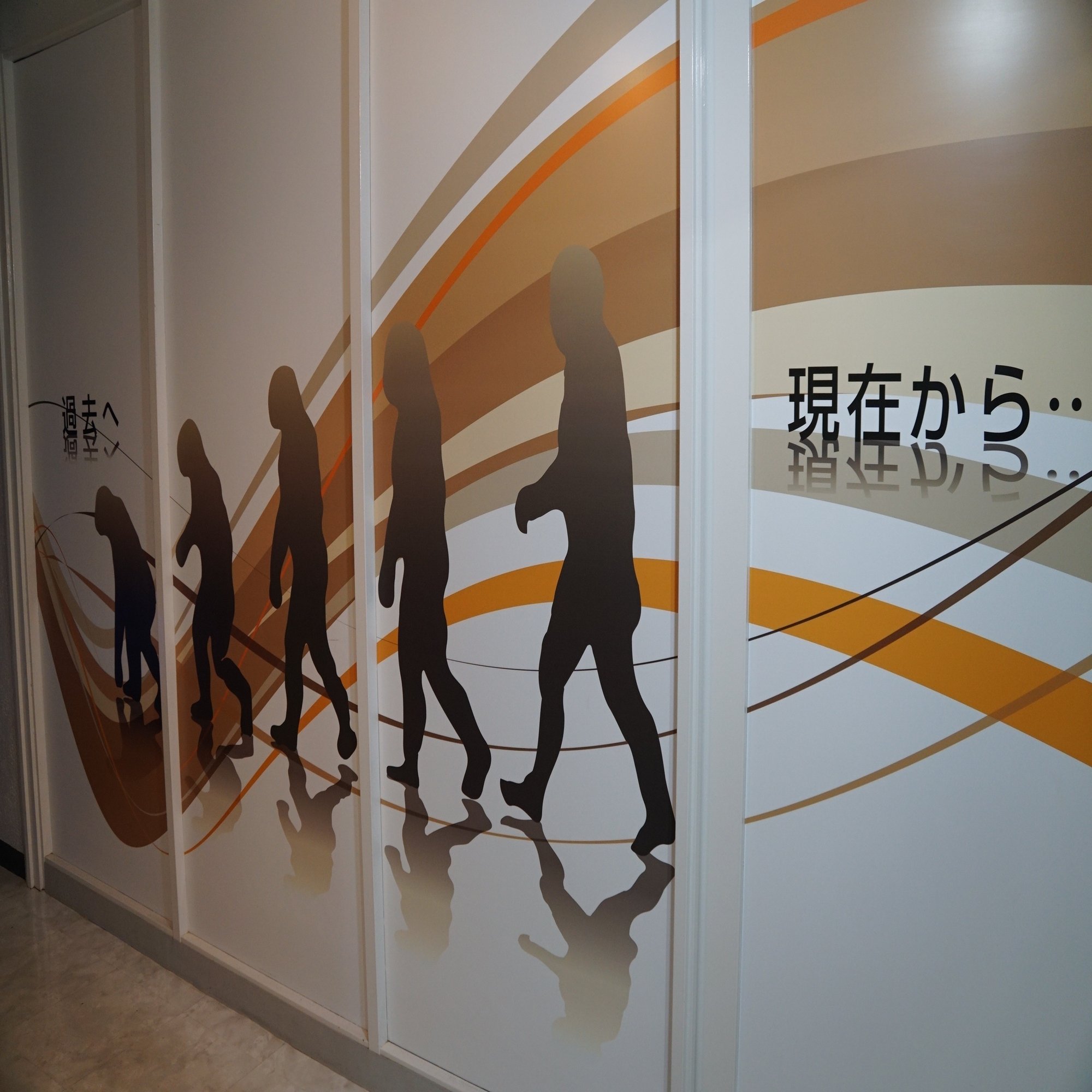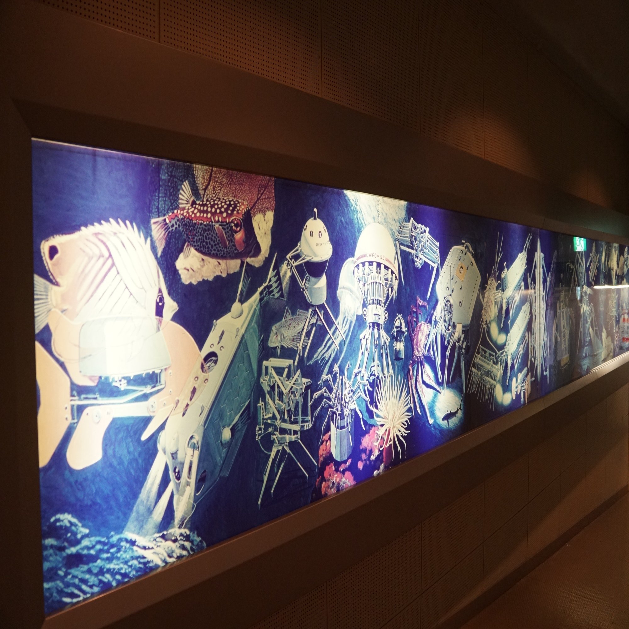 メカニマル達の子孫が活躍する壁画を見ながら出口へ。こういう未来は来ませんでしたが、海洋プラスチック問題などを見ていると、こんな風にきめ細かく自然と接するテクノロジーが必要なのかもしれないと思えます。