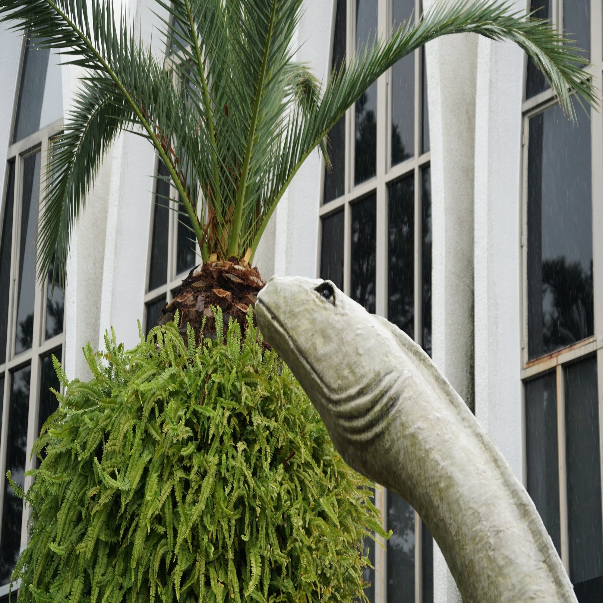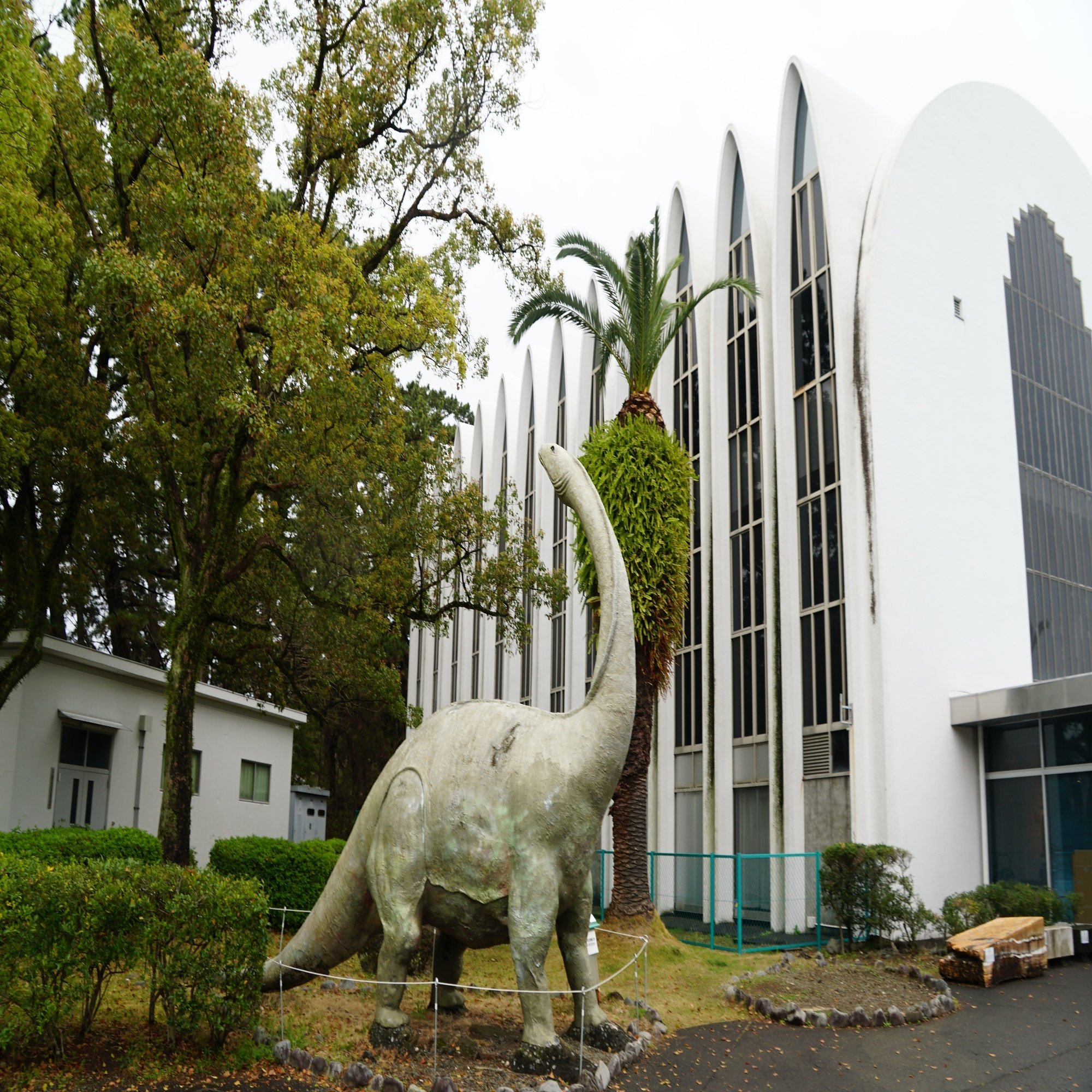 教会を思わせる建物の前に、昔はよく図鑑に載っていたけれど今はとてもマイナーなケティオサウルスの像が立っています。ヤシの木もここが海辺だからというだけでなく白亜紀から存続するものです。