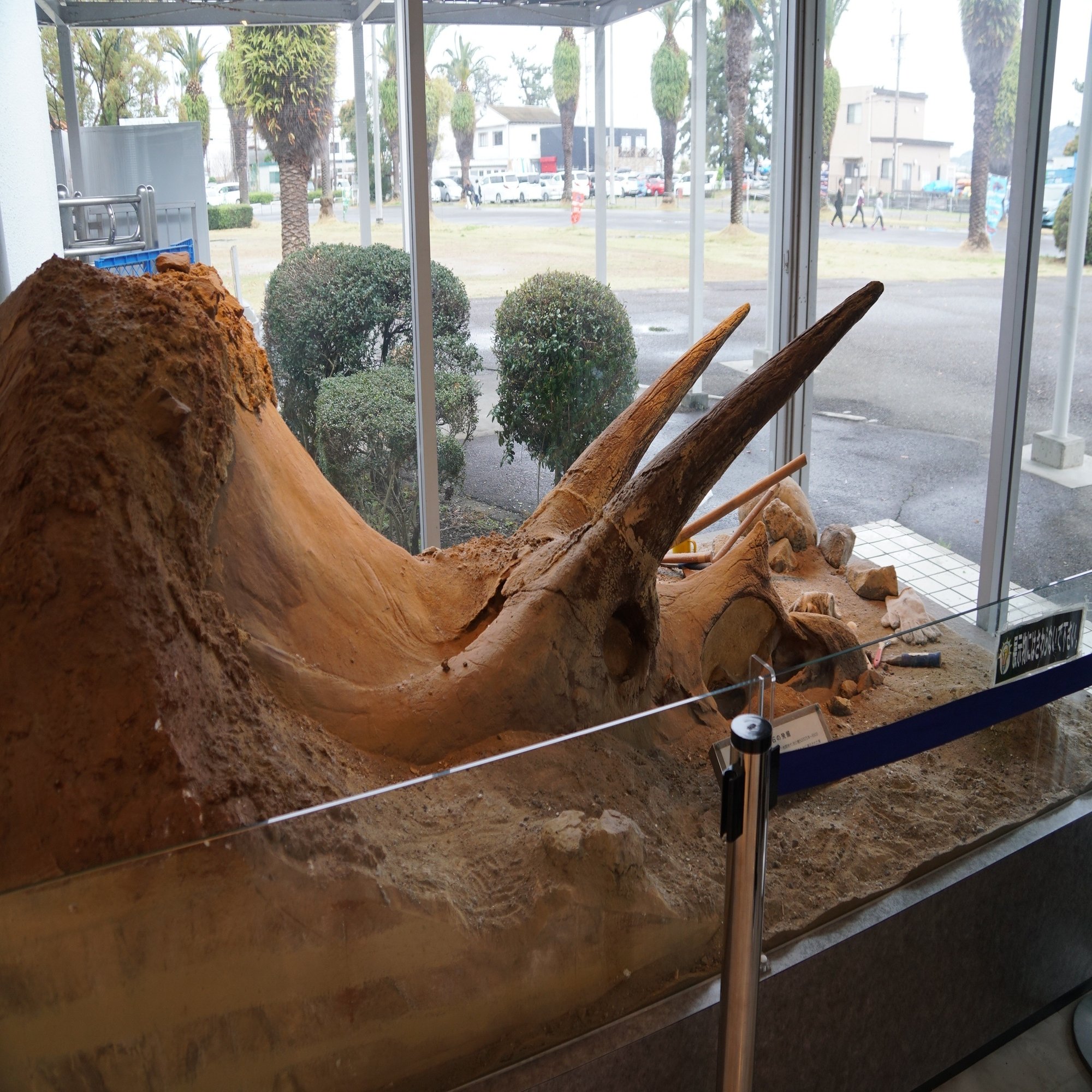 アンモナイトの一種ハルポセラスと、トリケラトプスの発掘を再現した展示が出迎えます。