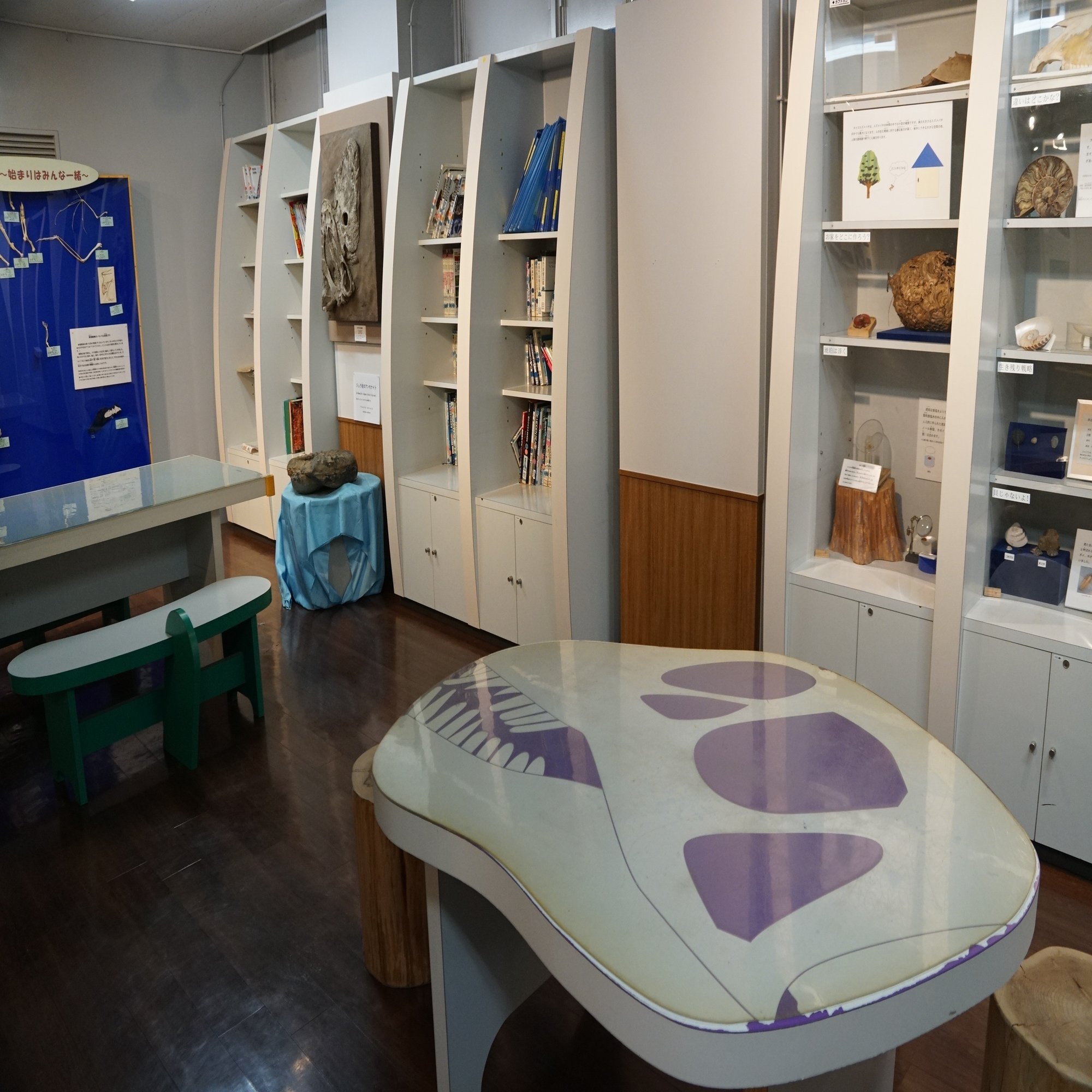 図書コーナーにはカマラサウルスのテーブルと丸太のスツールがありました。以前は自由に触れる標本があったのですが、このときは身近な生き物からアンモナイトまで様々な展示になっていました。
