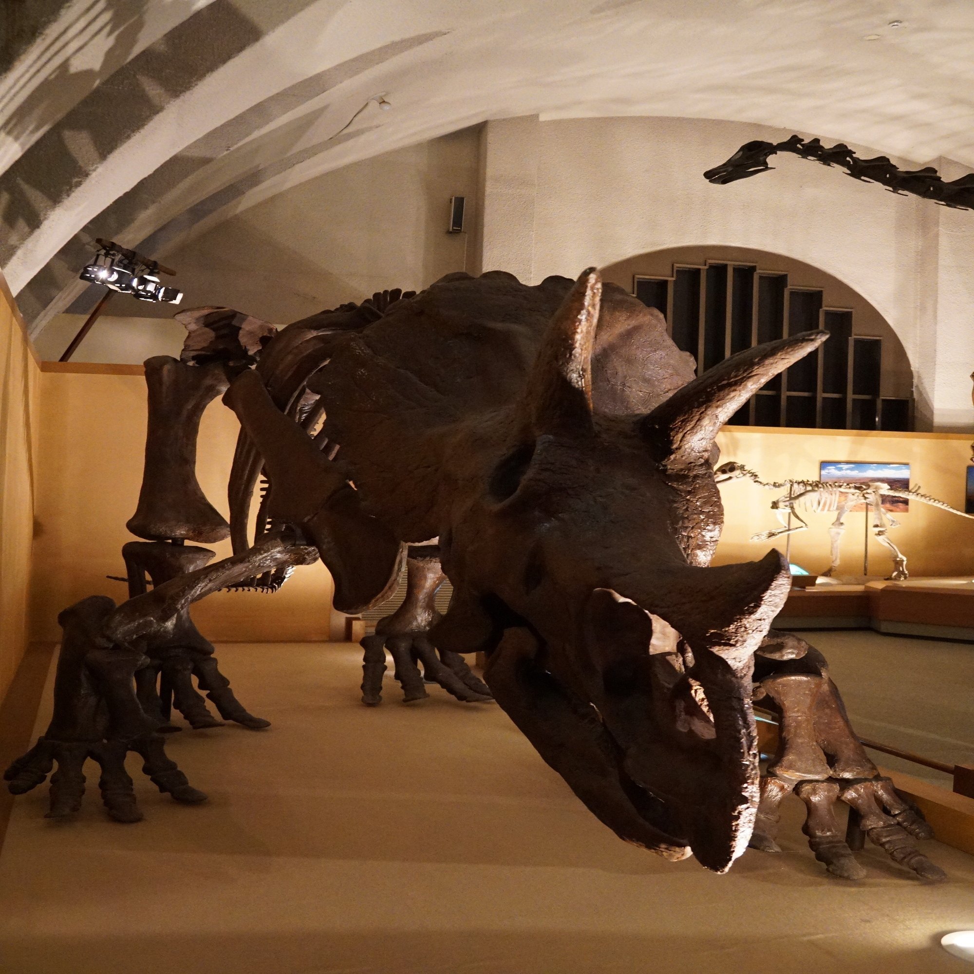 首と尾を長く前後に伸ばしている、まるで橋のような恐竜はディプロドクスです。この荘厳な空間の主役にふさわしい存在感でした。