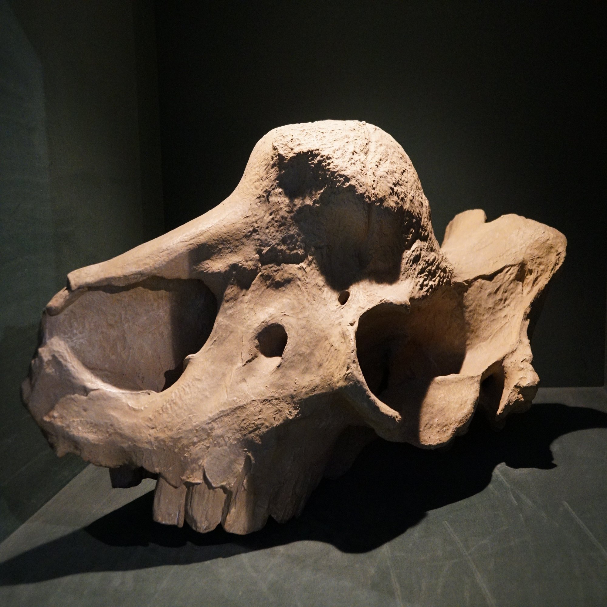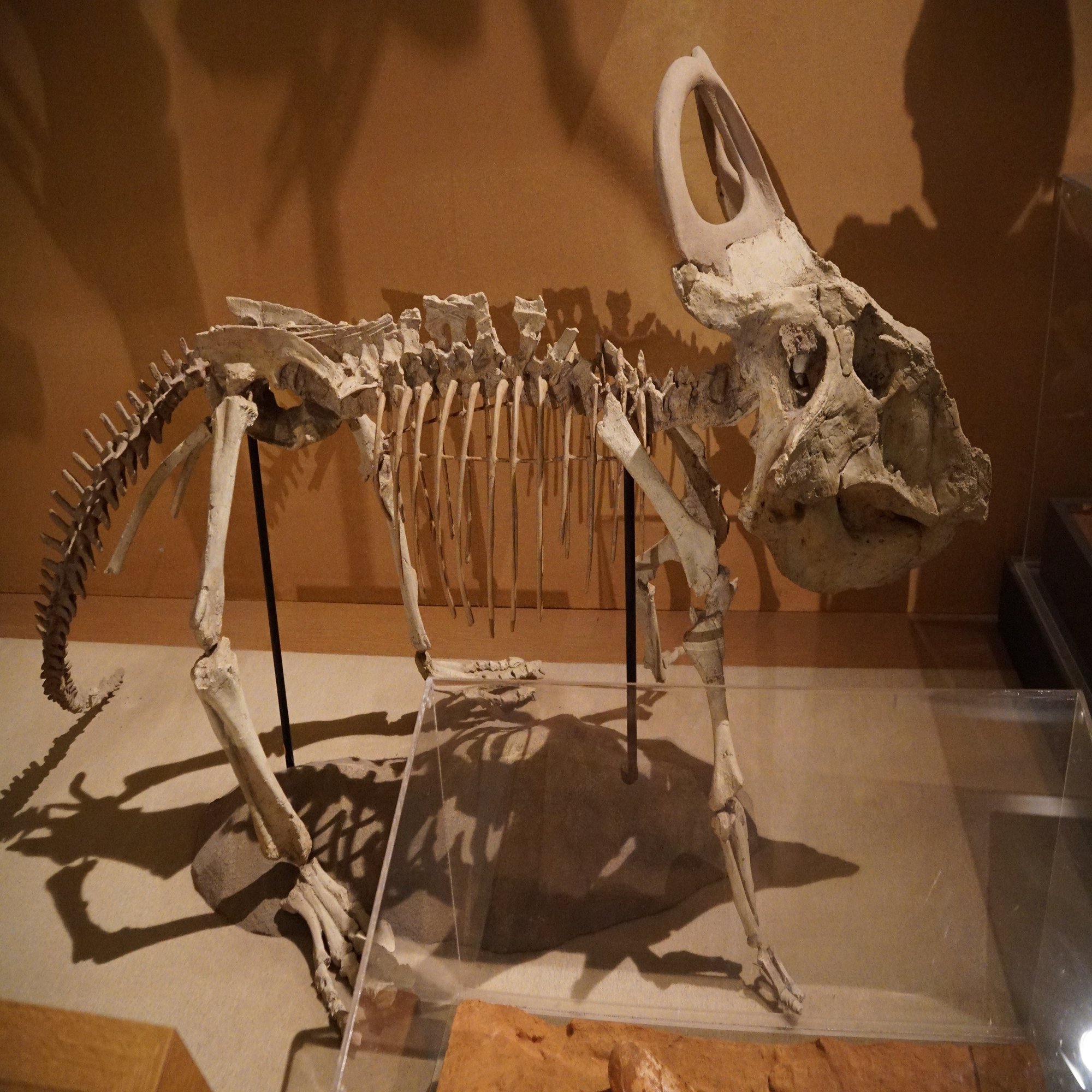 一見サイに似ているものの骨でできた空洞の角を持つエンボロテリウム。生きていたときは角というより異様に鼻が高いように見えていたとも言われています。
