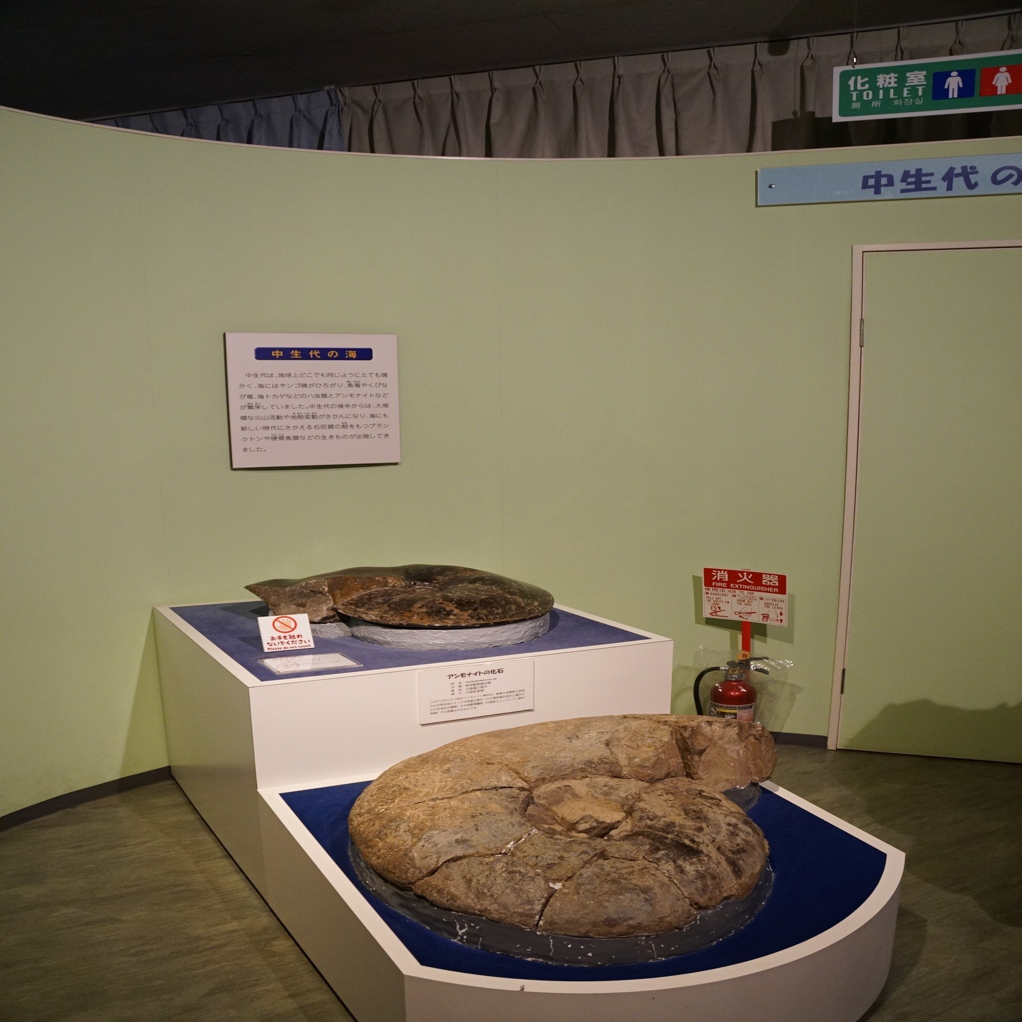 2階に降りると中生代(恐竜時代)の植物や海の生き物、新生代(その後)の生き物の展示へと進みます。まずは大型アンモナイト。