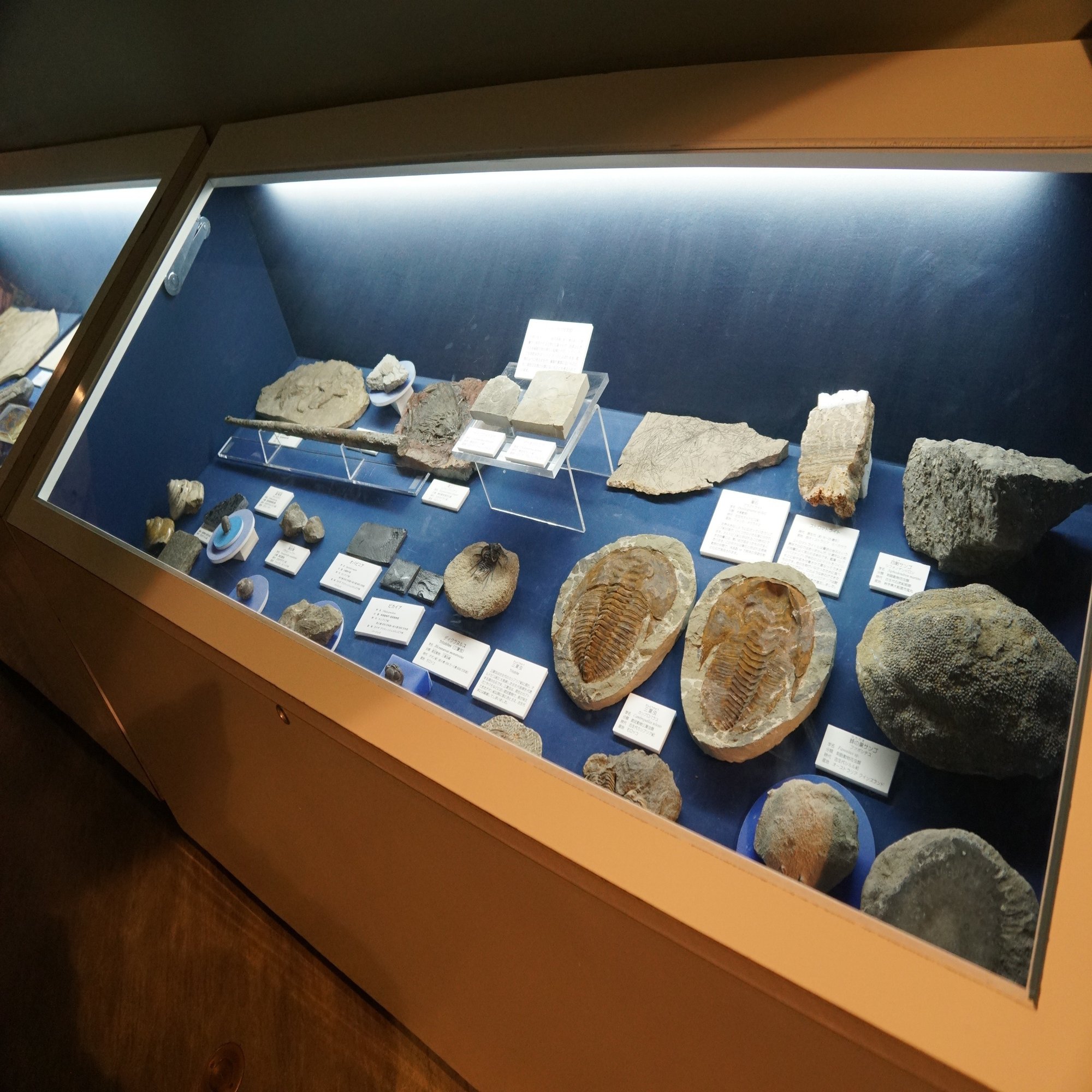 化石といわゆる生きた化石の対比。なんだか異様に凝った什器を使っていました。