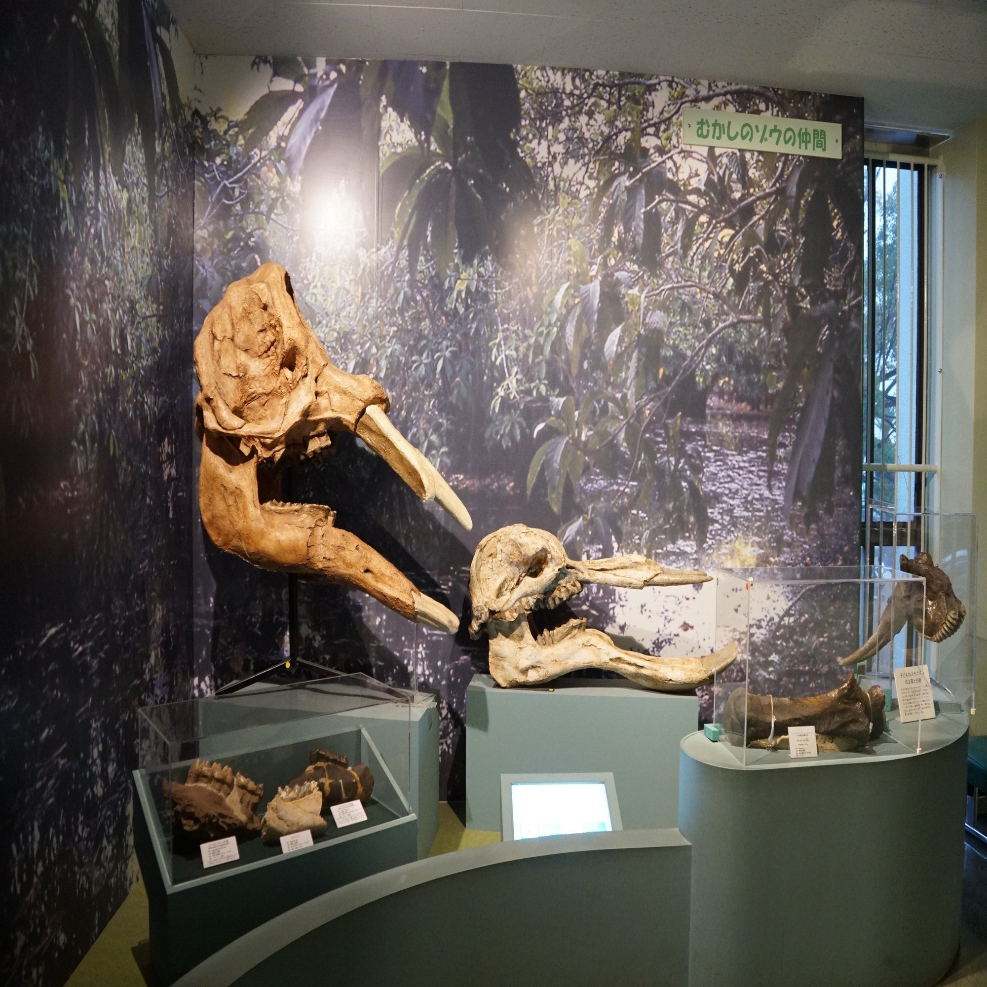 新生代の展示はいきなりフルスロットルでゾウから始まります。鼻だけでなく顎も長かったゴンフォテリウムとプラティベロドンがドドンと。