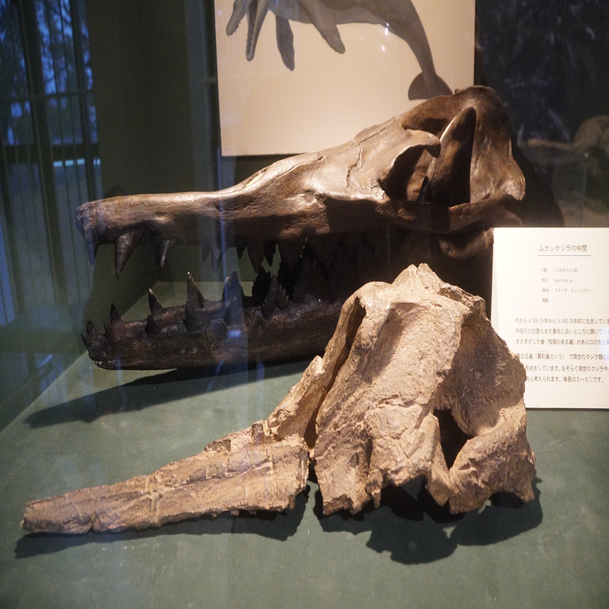 さらに大型哺乳類の頭骨が汽車窓式のような形で続きます。これは鯨類のサハリノケトゥス(手前)とジゴリザ(奥)。