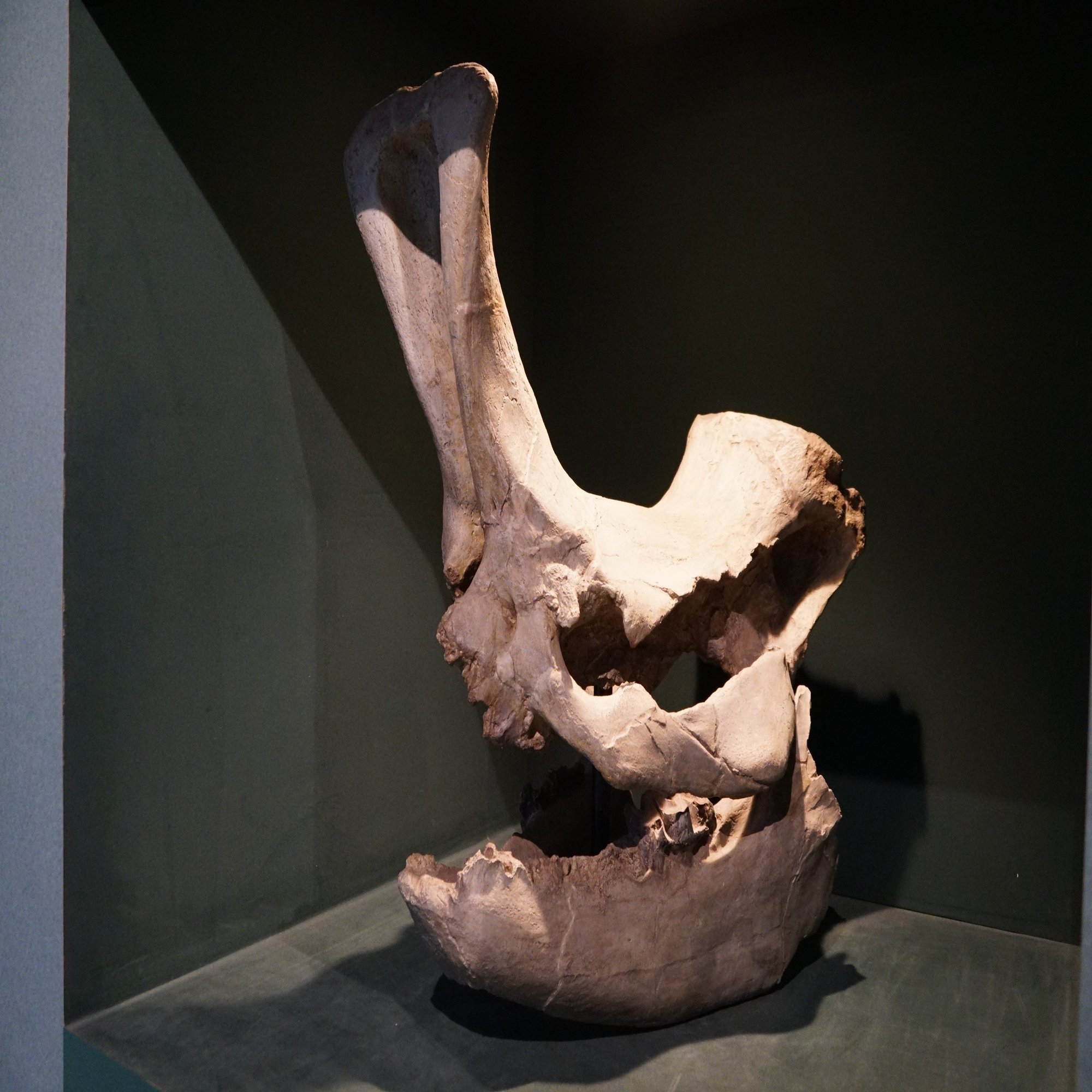 角の土台が非常に発達したサイであるエラスモテリウム。さぞ長い角が生えていただろうと考えられてきましたが、ごく最近これは声を響かせるドームであるという説が出ました。