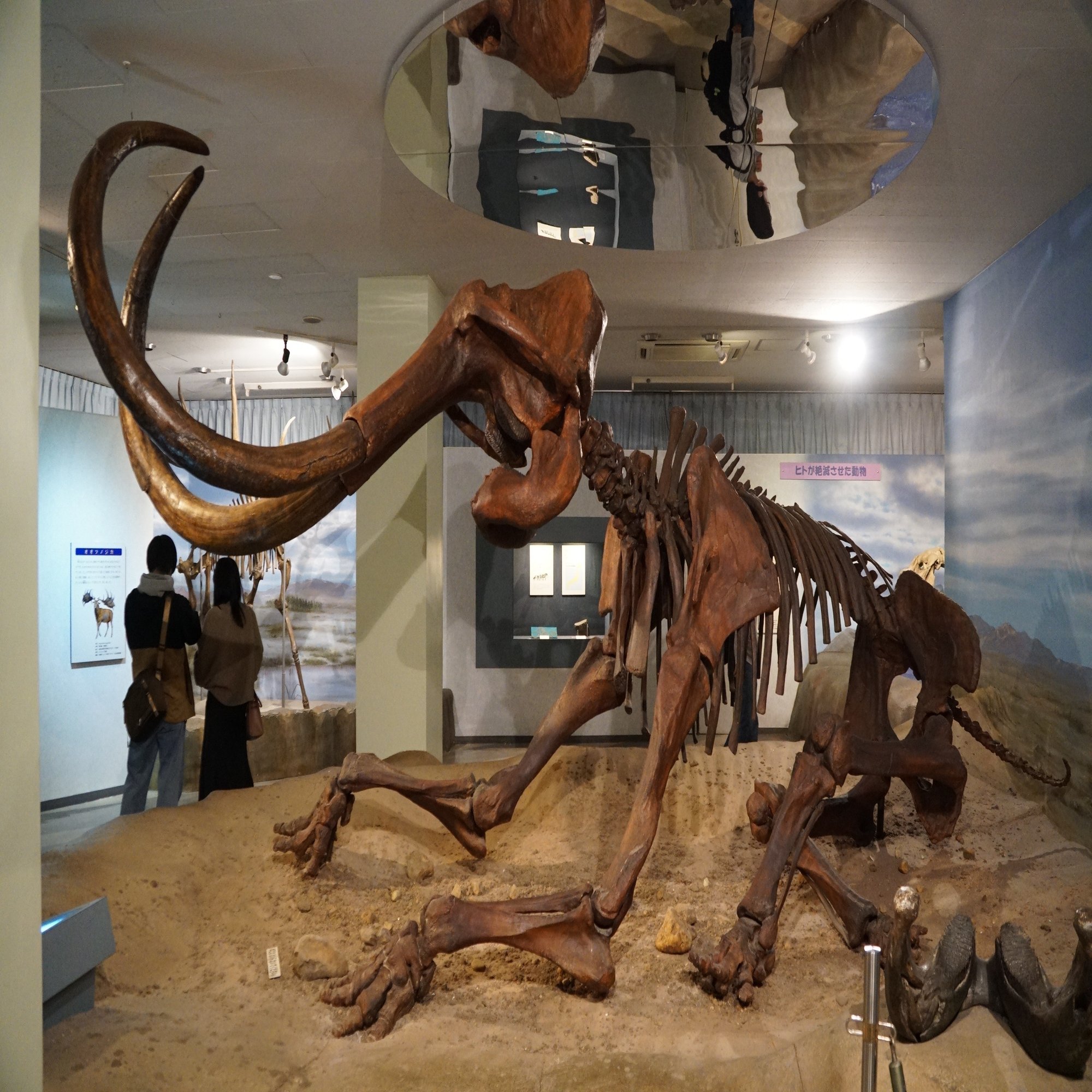 ちょっとした広間に出ると、なんとケナガマンモスが這いつくばっています。まさに人類にしとめられる寸前のポーズであるようです。天井につっかえるのも防ぎつつ動きや年代背景を表し、メッセージ性も持たせてある、ここならではの展示だったのです。