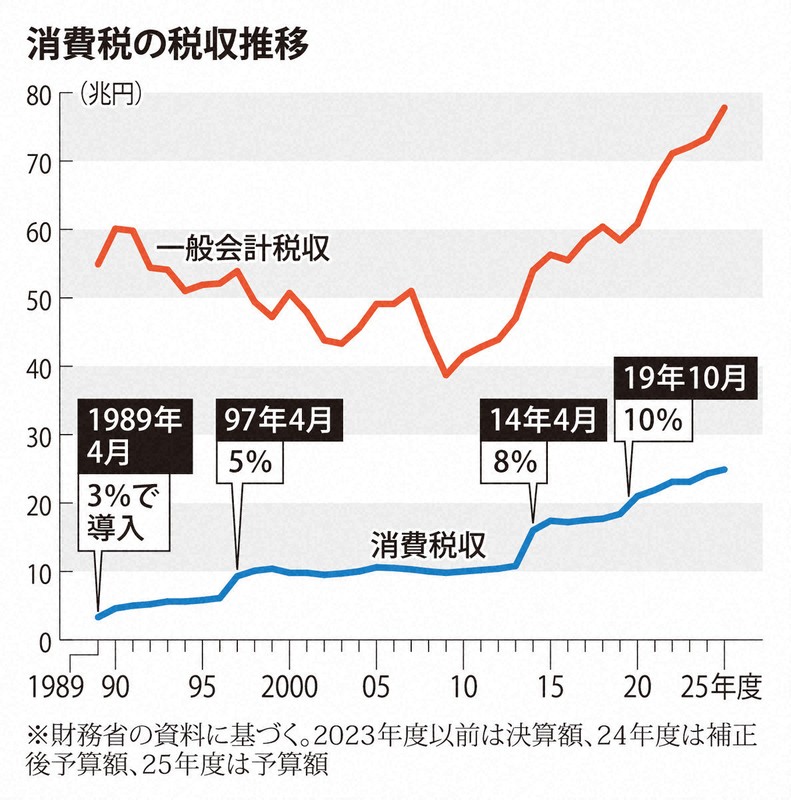 消費税が導入されたのは元号が昭和から平成に変わった89年のことだ。3%でスタートし、社会保障の充実などを理由に段階的に引き上げられてきた。