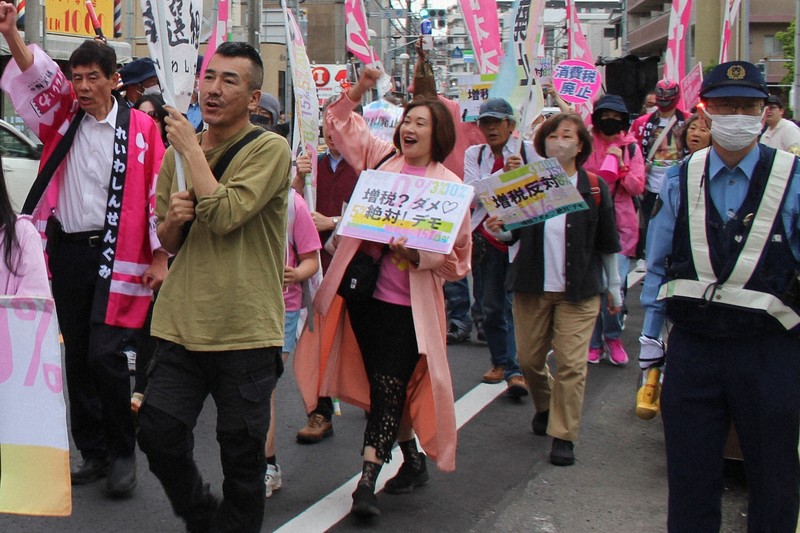 東京都心から急行電車で約20分。5月下旬、埼玉県所沢市の中心部で「消費税廃止」を掲げるれいわ新選組のデモ行進があった。