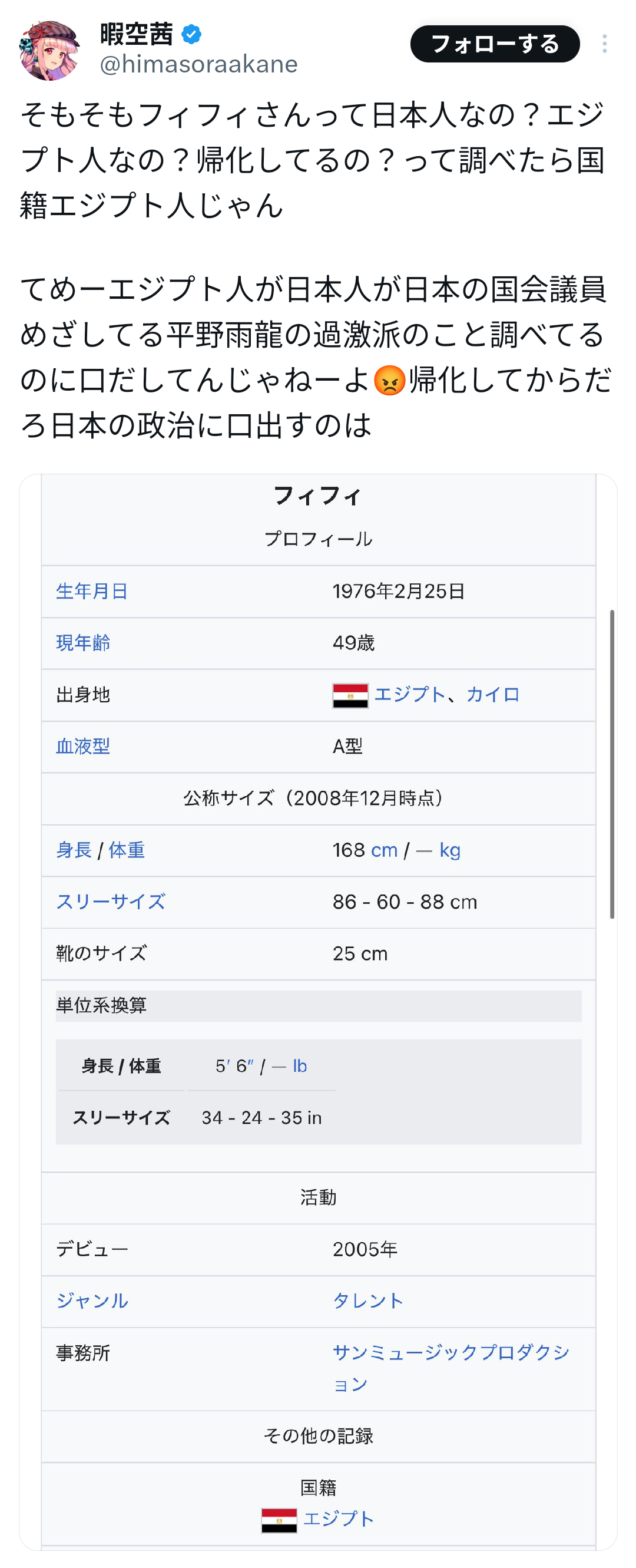 フィフィ「いいですか?丸坊主にして謝れよ!てめぇ!いいか!お前、帰化してなかったんだなっつったよね私のこと。人を舐めんな!中国人かお前マジで。中国人だろ。困るんだろ?私みたいに愛国者が日本人になって、この国をどんどんどんどん強くさせることが怖いんだろ。あの辺の連中全部そうだ。帰化してんですか、帰化して…お前らだろ!一番匿名の。何にも出せもしない名前も顔も。謝れよ!出しただろうが今これを。謝れ!私帰化しましたって書類もあります。でも何でここまでしないといけないの?いちいち、てめぇらみたいに匿名の連中、中国の息がかかったどんだけ金積んでやってるか知らねぇけど。それか習近平先生の為にってやってんのか知らねぇけど、情けなくならない?しかも機能出てたけどパクられたのあんた42歳にもなって、43歳か。43歳にもなって帰化した帰化してないとかずーっと執着してやってんの、馬鹿じゃないのお前マジで。いいおっさんだろうがホント。私めっちゃ攻撃されてんだわ。何か知らんけどお前、『帰化してないのに文句言ってんじゃねぇよ』とか言って『お前帰化って嘘ついただろ』とか、帰化した帰化してない帰化した帰化してない…うるせぇよ!まず、日本のこと思ってんならどっちでもいいわ。日本人も日本のこと思ってねぇ奴いらねぇからこの国に。出てけよ!まず、自分の好きな国行け!とっとと」