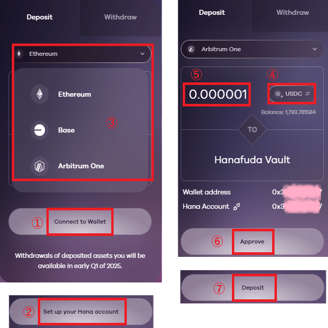 ウォレット接続 ⇨ "Set up your Hana account" ⇨ ネットワーク選択 ⇨ トークン選択 ⇨ 数量入力 ⇨ ”Approve" ⇨ 預入