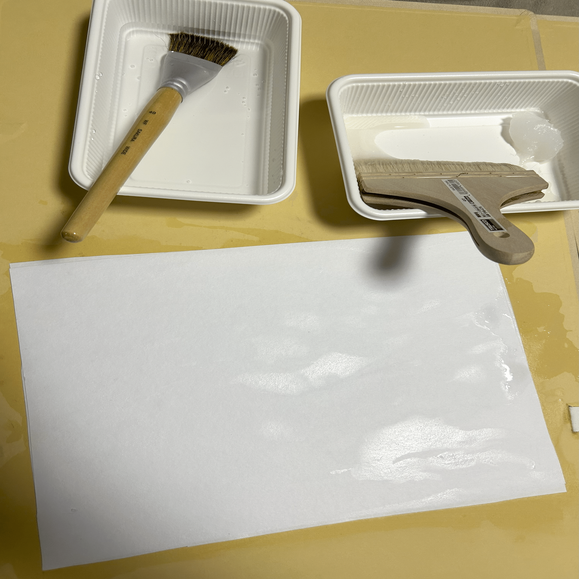 最初塗りすぎてほぼニスの板になってしまったので、塗る量も試行錯誤しています。表面に薄く一回だけ塗って、裏面には一切塗っていません。側面には筆で毛羽立ちを押さえながらほんの気持ち多めに塗っています。和紙の質感を保ちつつコーティングが出来たかなと思います。
