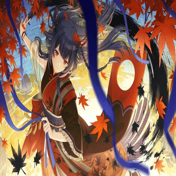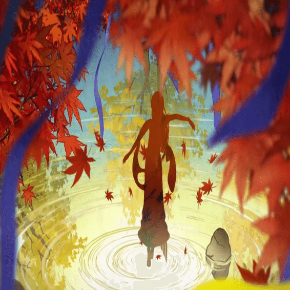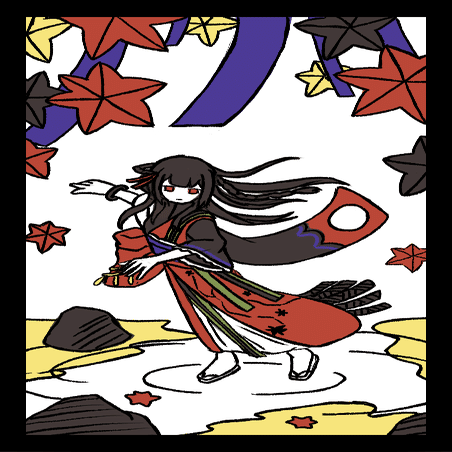 ・紅葉の葉を全て赤色にするか悩みましたが、実際の花札ではそういう例はなかったのでやめました。葉の色は"楓に鹿"を参考にしています。思い出演出において葉が全て燃えるような赤に染まっているのは重要な要素ではあります。