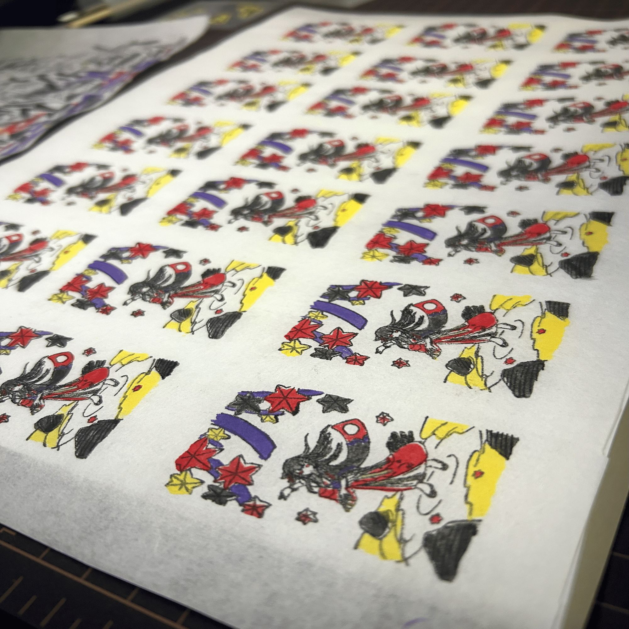ステンシルではなく全て手彩色にすればこのズレは避けられたのですが、自己満足によりステンシルを採用したためこうなっています。