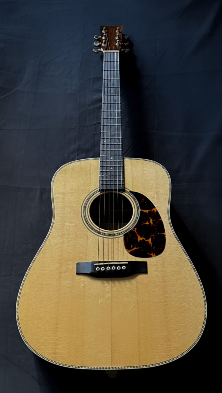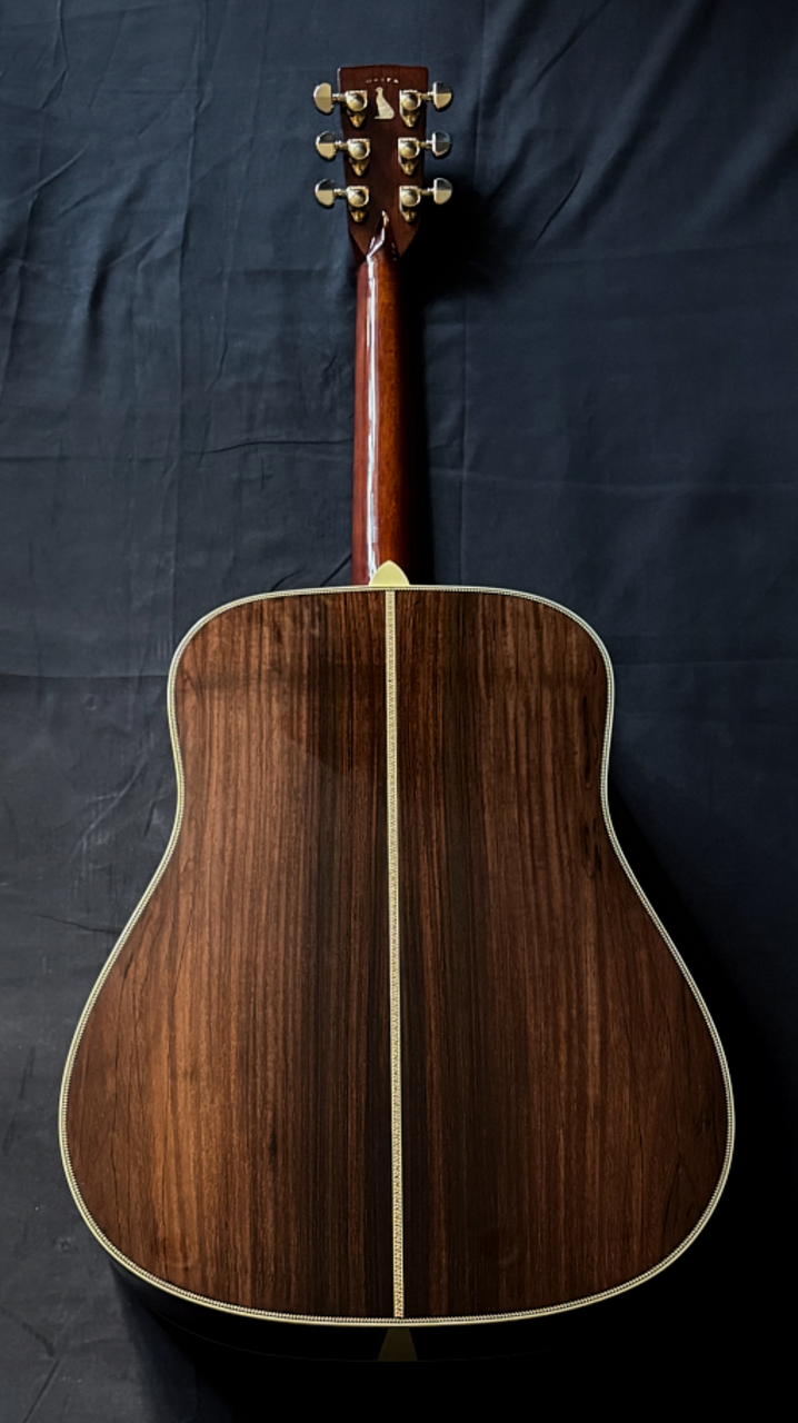 本器のボディサイズは、ドレッドノート。トップには最上級(プレミアムグレード)のイタリアンアルパインスプルースを使用、通常のスプルースには備わっていない説得力の高さと抜群の表現力、そして魅惑の音色感を兼ね備えます。そしてサイド&バックには、40年近くシーズニングした沖田正和秘蔵の極上ブラジリアンローズウッド(プレミアムグレード)を使用!!トップ・サイド・バック全てに厚みのある材を使用、通常のメーカー、製作家には真似のできない重厚なボディーが組み上げられております!!極上ホンジュラスマホガニーのネックとトップ、サイド、バック、SQ(スクエア)トラスロッドとが沖田正和の手によるスペイン式ネックジョイント方式で見事に組み合わさり通常では考えられないバランシングと剛性の高い音の出力、大変説得力のある、イタリアンアルパインスプルースならではの美しく説得力と音色感のある魅惑のサウンドを出力、実現しております。沖田正和独自のスキャロップドXブレーシングにより、スキャロップとは思えぬ程の厚みのあるサウンドを出力いたします。またOKITA GUITARSのさらなる特徴となります、生音そのものでの抜群のバランシング、コード感の、ピッチの素晴らしさにより、ライブ、録音時とあらゆる音楽ジャンル、奏法、運用においても安心して音楽を委ねることを可能にした唯一無二のまさに究極、夢のギターです!!!6年を経過しておりますので若干の使用感(細かい、小さい傷等)は見られますが美品です。