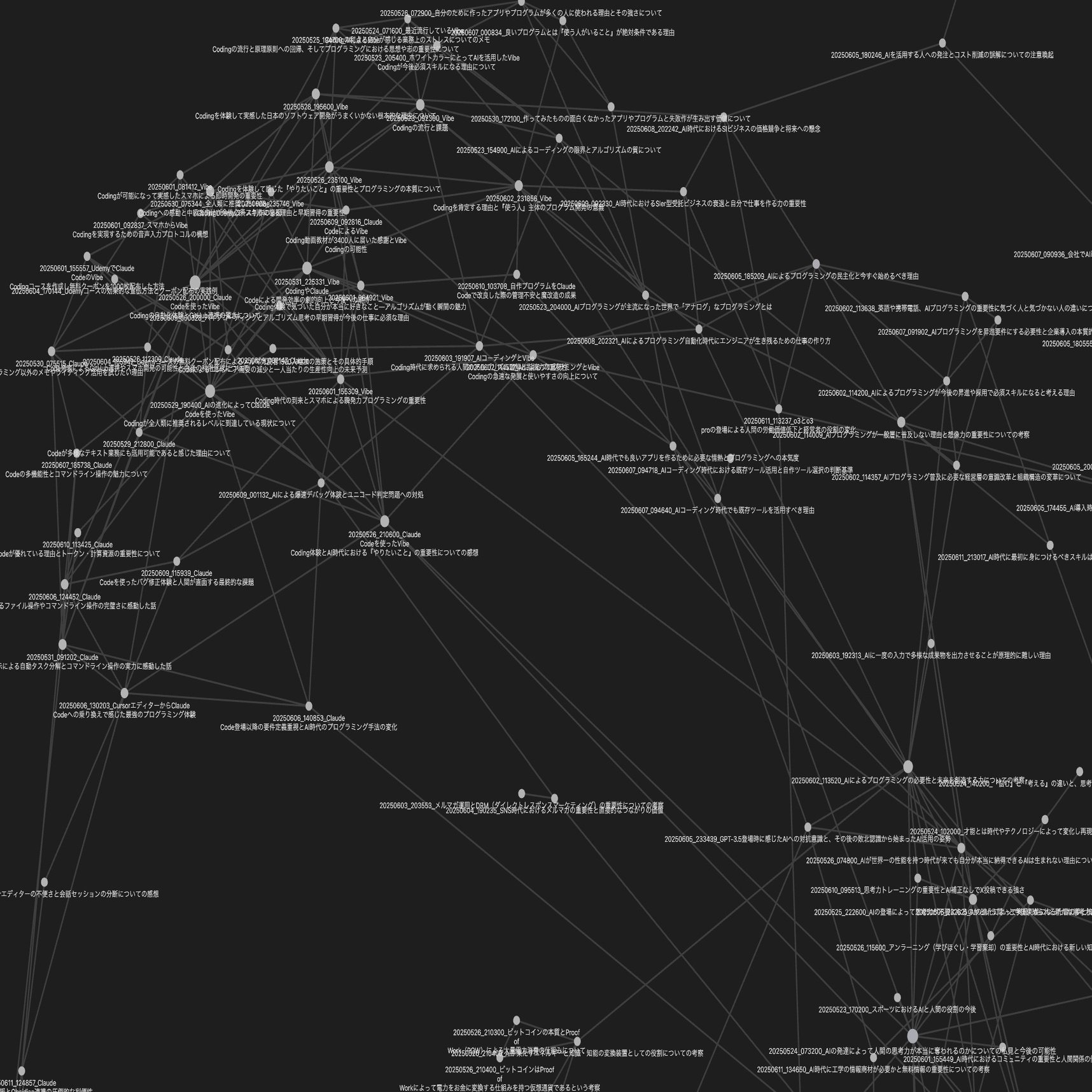 もう一つの大きな発見は、メモ同士のリンクが生み出す創発効果でした。ObsidianとZettelkasten方式で知識の紐付けとメモの楽しさを実感し、一見無関係だったアイデア同士が意外な形で結びつくようになりました。