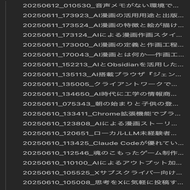 この形式の最大のメリットは、時系列順に自動で並ぶことです。Obsidianでファイル一覧を見ると、常に最新のメモから順番に表示されるため、最近考えていたことをすぐに振り返ることができます。