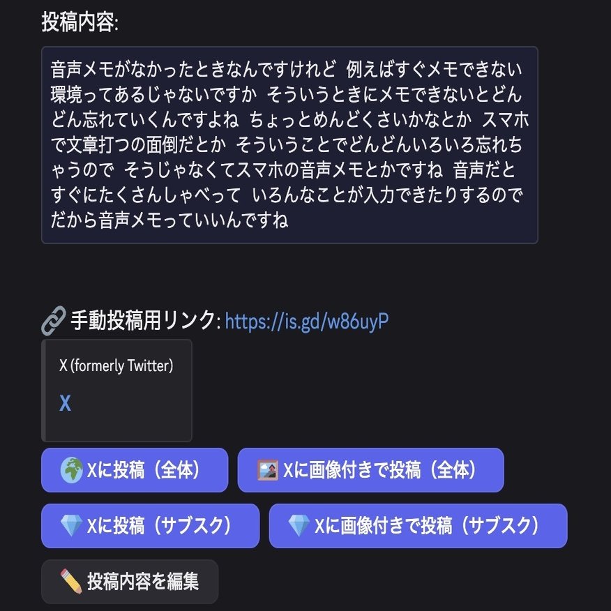 具体的には、Discordに音声で投稿すると、AIが自動でまとめる仕組みを作り、内容を整形してX(Twitter)に投稿するボタンも用意しました。既存のメモと照合して連携も自動で行い、内容が良さそうなものは投稿用に変換してくれるので、ボタンをポチポチするだけでSNSにどんどん投稿できます。