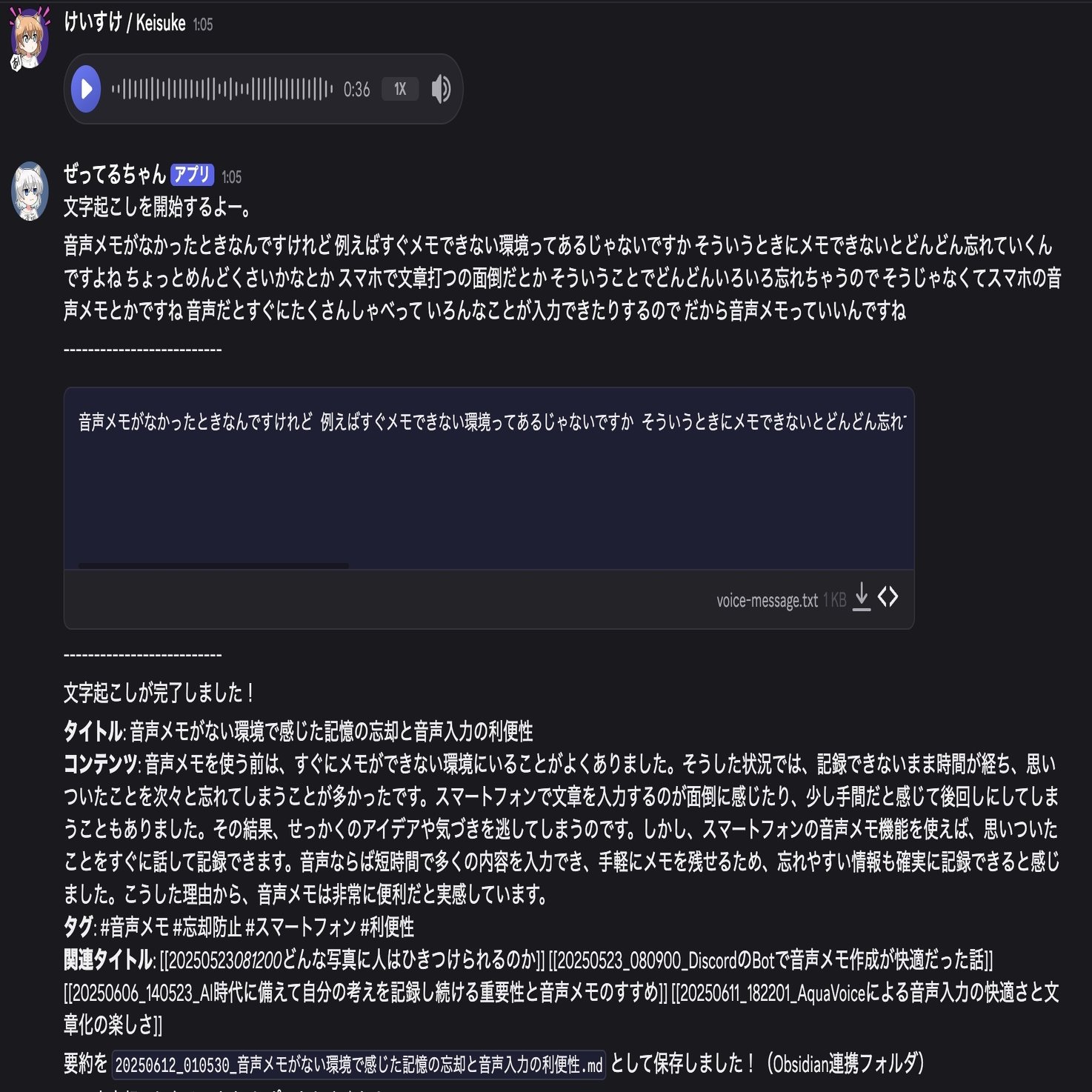 実際に、この記事も音声ファースト思考術を活用して執筆しています。アイデアを音声で記録し、それをもとにAIを活用して文章を生成し、Obsidianで管理するというワークフローです。