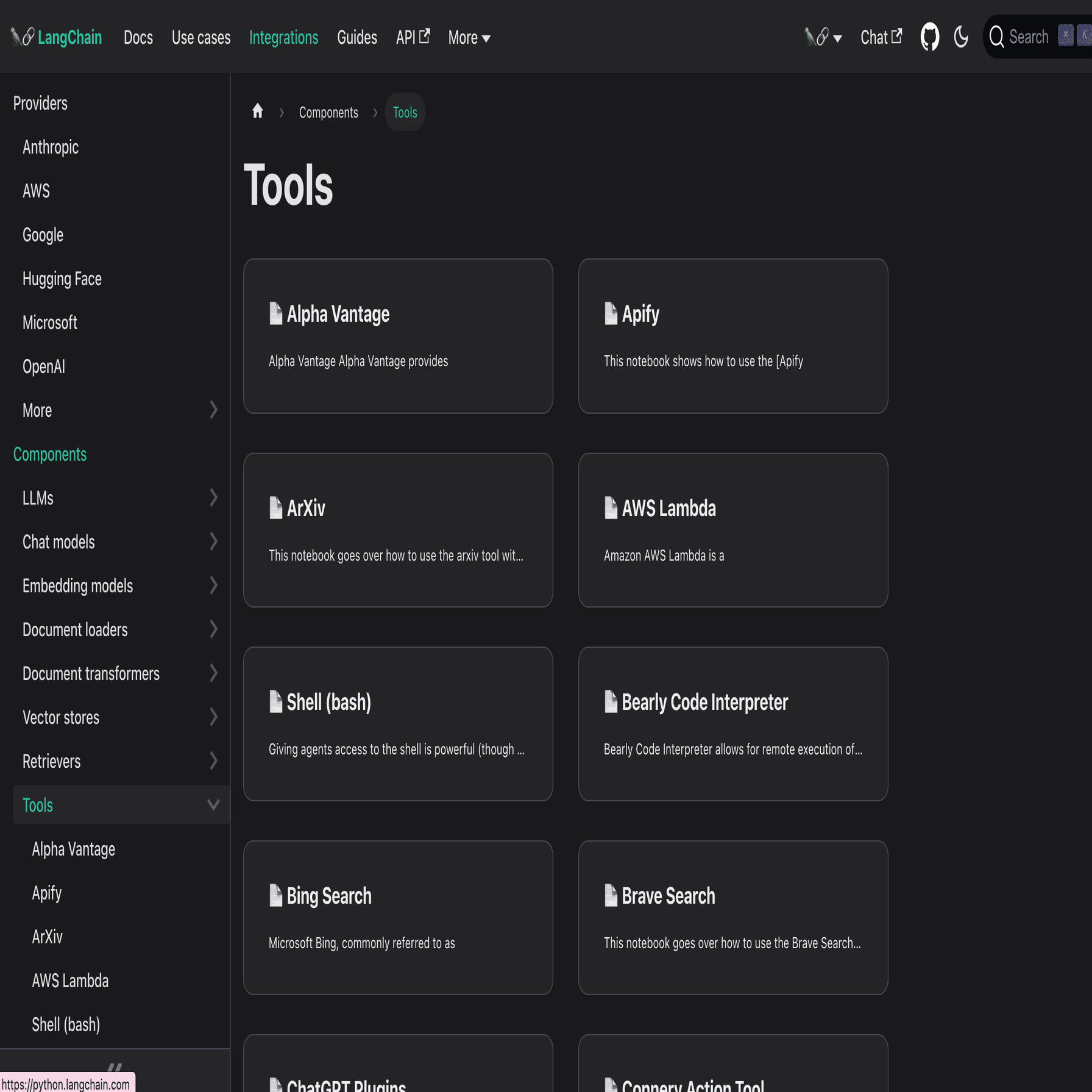 以下、LangChainToolsの一覧。この機能を、Agentに追加できるということです。