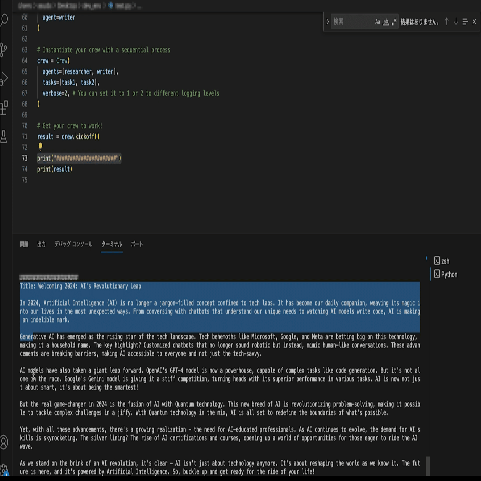 以下のように、crewをインスタンス化し、結果の出力のコードを書きます。