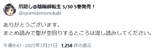 陰陽師8章も読者無視して自分勝手な展開押し付けて打ち切りになりそうでリラックスできませんね - 94二次元好きの匿名さん25/08/11(月) 20:06:09