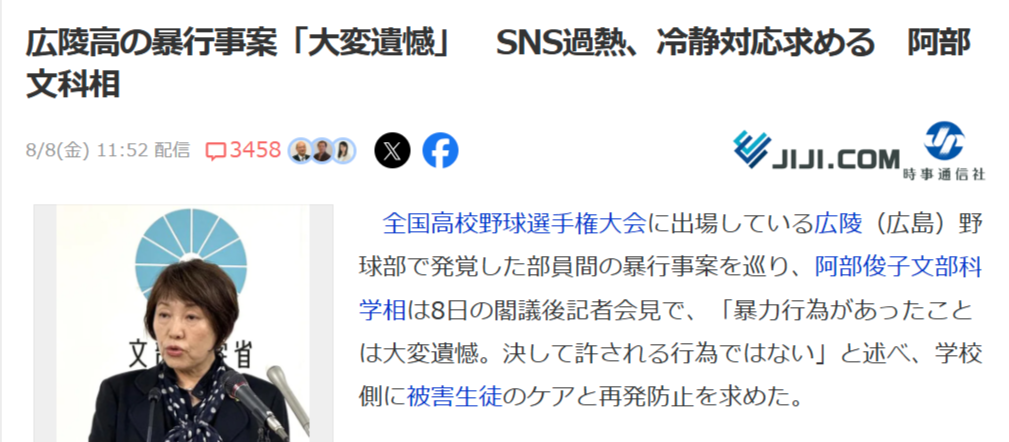 全国高校野球選手権大会に出場している広陵(広島)野球部で発覚した部員間の暴行事案を巡り、