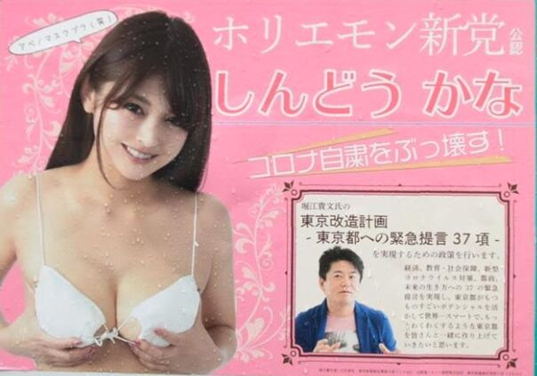 新藤加菜という名前が最初に注目されたのは、恐らくホリエモン新党とかいう団体から出馬した際に「アベノマスクブラ」とかいうわけのわからん意味不明な品性の欠片もない選挙ポスターを街中に張り出した時でしょう。