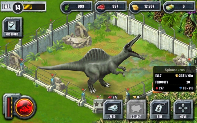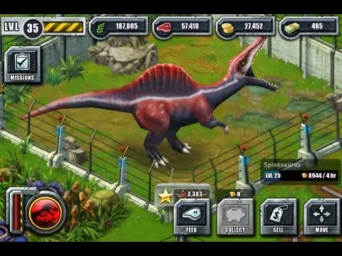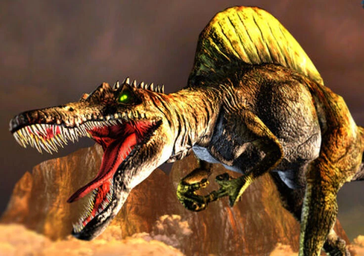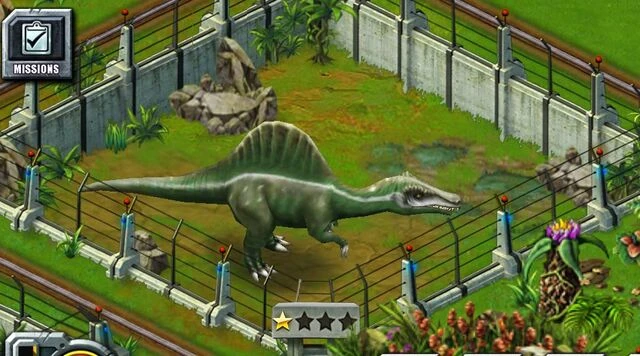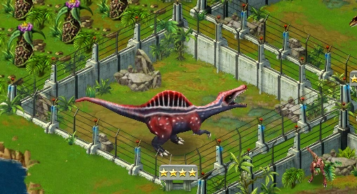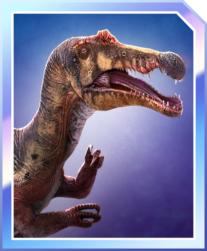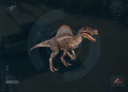 カラーリングは映画に登場したものにそっくりだが、やや黒みがかっている。 ティラノサウルスとの戦闘ではランダムでどちらかが死亡する特殊モーションが発生する場合があり、スピノサウルスが勝利する場合は劇中よろしく顎と手で頭を押さえつけてトドメを刺す。