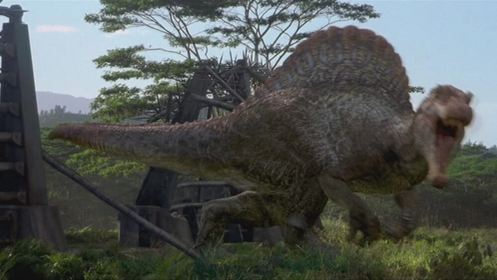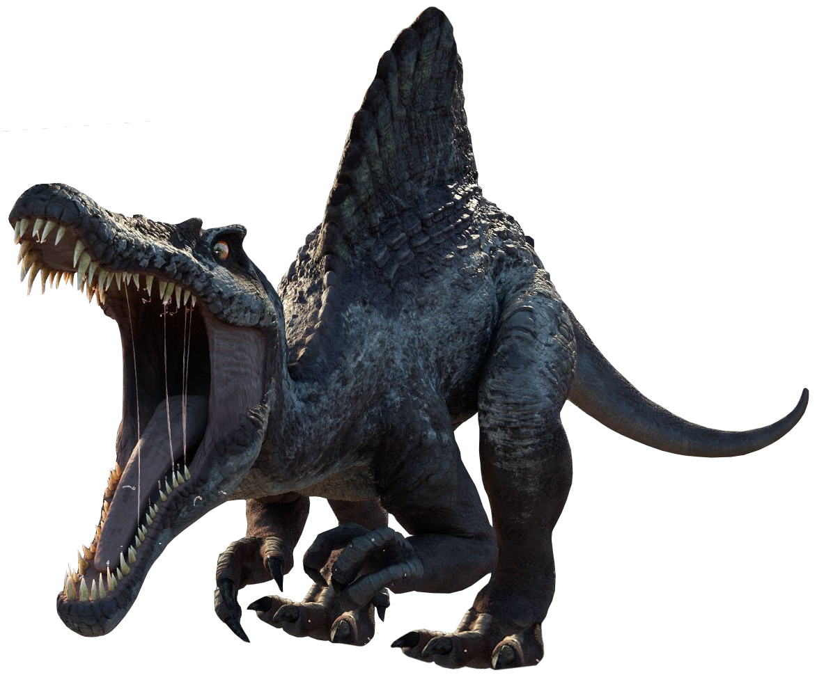 この作品が公開された時点にて確認されていたスピノサウルスは劇中に登場した雄個体1体のみであり、それ以外の個体群が存在しているかどうかは不明、存在していたとしても個体数は一桁以上に達することはなかったらしく、非常に希少な恐竜とされていた。 尤も現在の観点からすると食性、生態、容姿、戦闘能力などが本来とは乖離している……とよく槍玉に挙げられる恐竜の一種だが、ジュラシックシリーズでは当たり前なのでそういうものと捉えるしかないだろう。そもそもT-REXとギガノトサウルスが同時期同時代に生きていたというトンデモ先史時代がシリーズの正史となっている時点で、本来の姿がどうこうというのも詮ない話である。