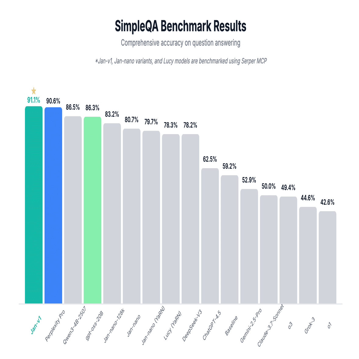 毎日AIニュースを追いかけているのだが、今日は大漁だった。他にもすごいネタあるんだけど、とりあえず試してみたのが、Jan-v1というモデル。なんとわずか2.5GBしかない!(GGUF版)。パラメータ数はわずか40億だ。下手すりゃ携帯で動くぜこれ。これは正真正銘、ご家庭の時代が来た!と言えるのではないか。もう128GBのRAMとかいらねえぜ。普通のMacでも動くぜー