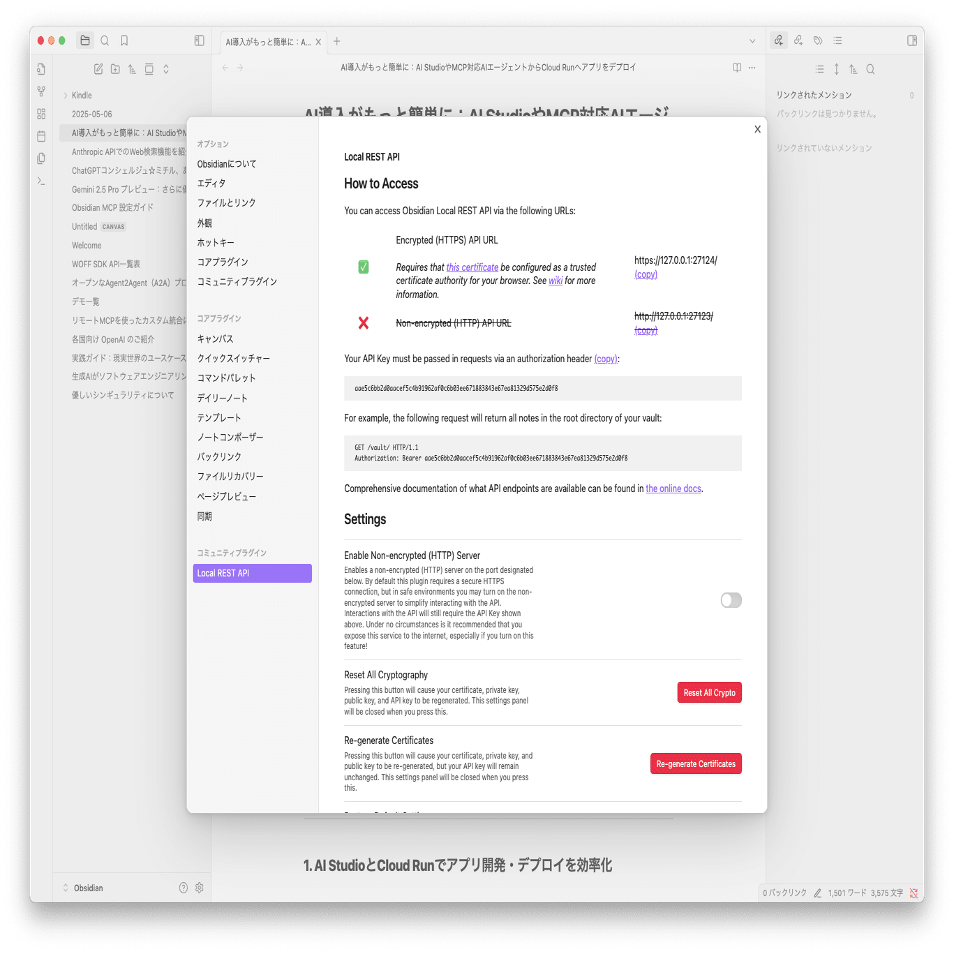 }2. Obsidian REST API の設定