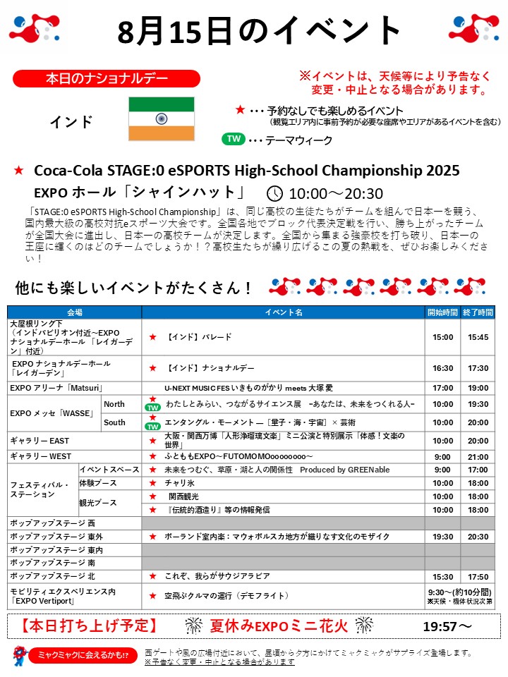 8月15日(金)の万博情報です