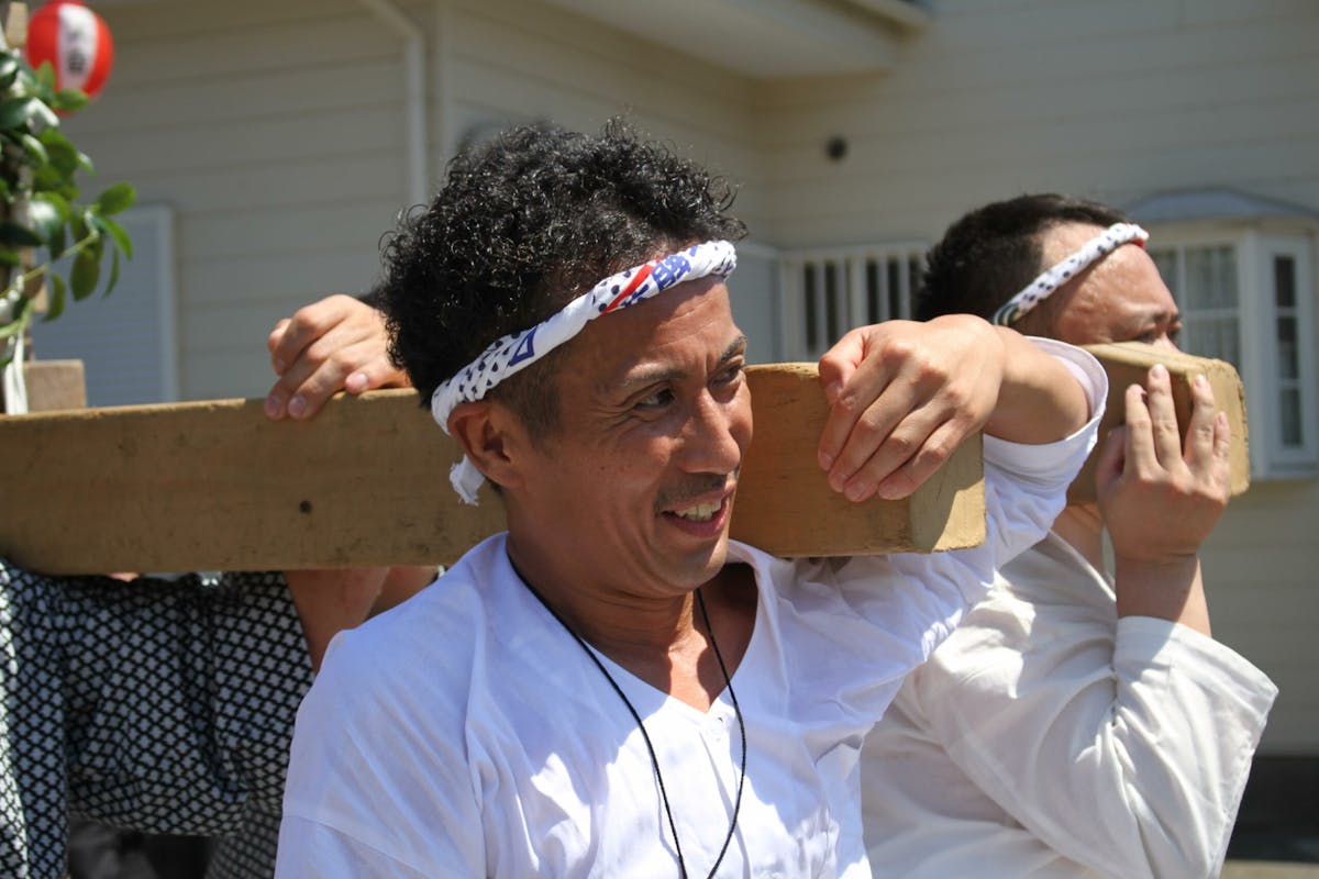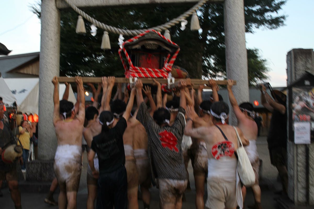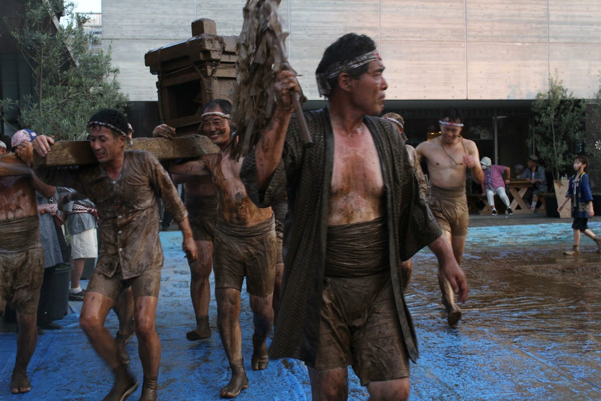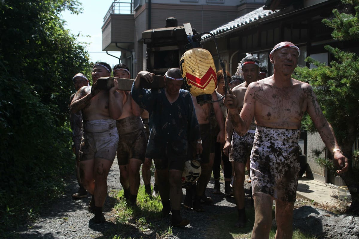 神輿ってこんなこともできるんだ、と無限の可能性を感じさせてくれた「どろいんきょ」。神様の乗り物にそんな恐れ多いことを…と最初はひるみますが、泥まみれになりながら神輿を転がしたり、担いだりする地元の方々の姿を見ると、その不安は杞憂だったことがわかります。