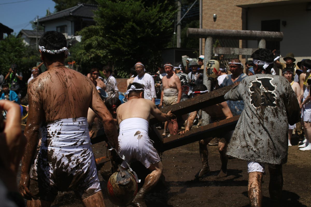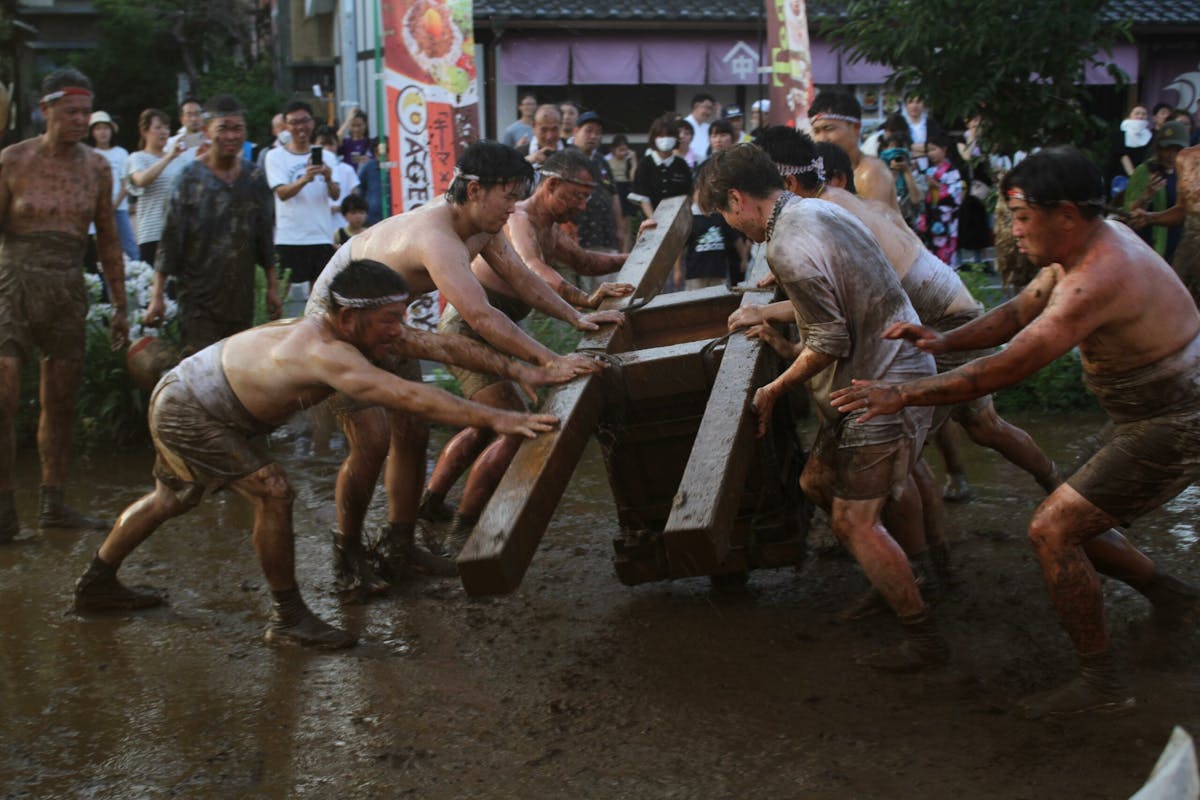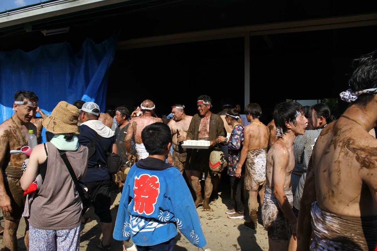 泥にまみれながら、傍からはバケツやホースで水をかけられ続けます。泥跳ねは観客の方にも躊躇なく飛んでくるため、見ている方も真剣(ガチ)勝負。結局は、みんな泥まみれになってしまうのですが、とにかく楽しい! しかも、この泥をかぶると家内安全・無病息災・悪病退散のご利益につながるそうです。