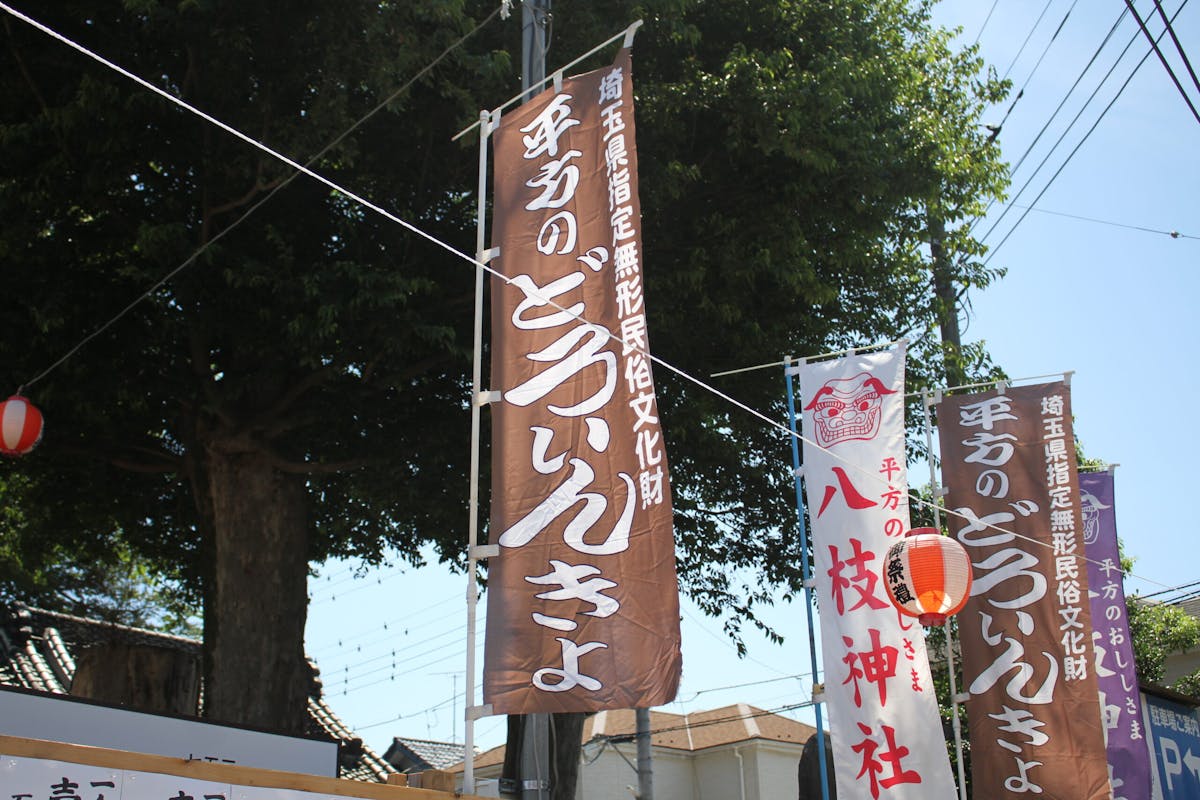 上尾市無形民俗文化財活用活性化実行委員会『平方上宿の祇園祭 どろいんきょ』によりますと、どろいんきょは、平方の上宿地区にある八枝神社の祇園祭の中で行われる行事。