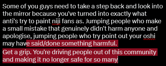 It's dumb how some Niji fans are like "OMG WHY ARE PEOPLE SO MEAN TO US JUST LEAVE US ALONE WE JUST WANNA SUPPORT OUT OSHIS" but attack other fans who say anything that's slightly wrong or non positive. It's sad how much this community devolves and proves to antis they were right