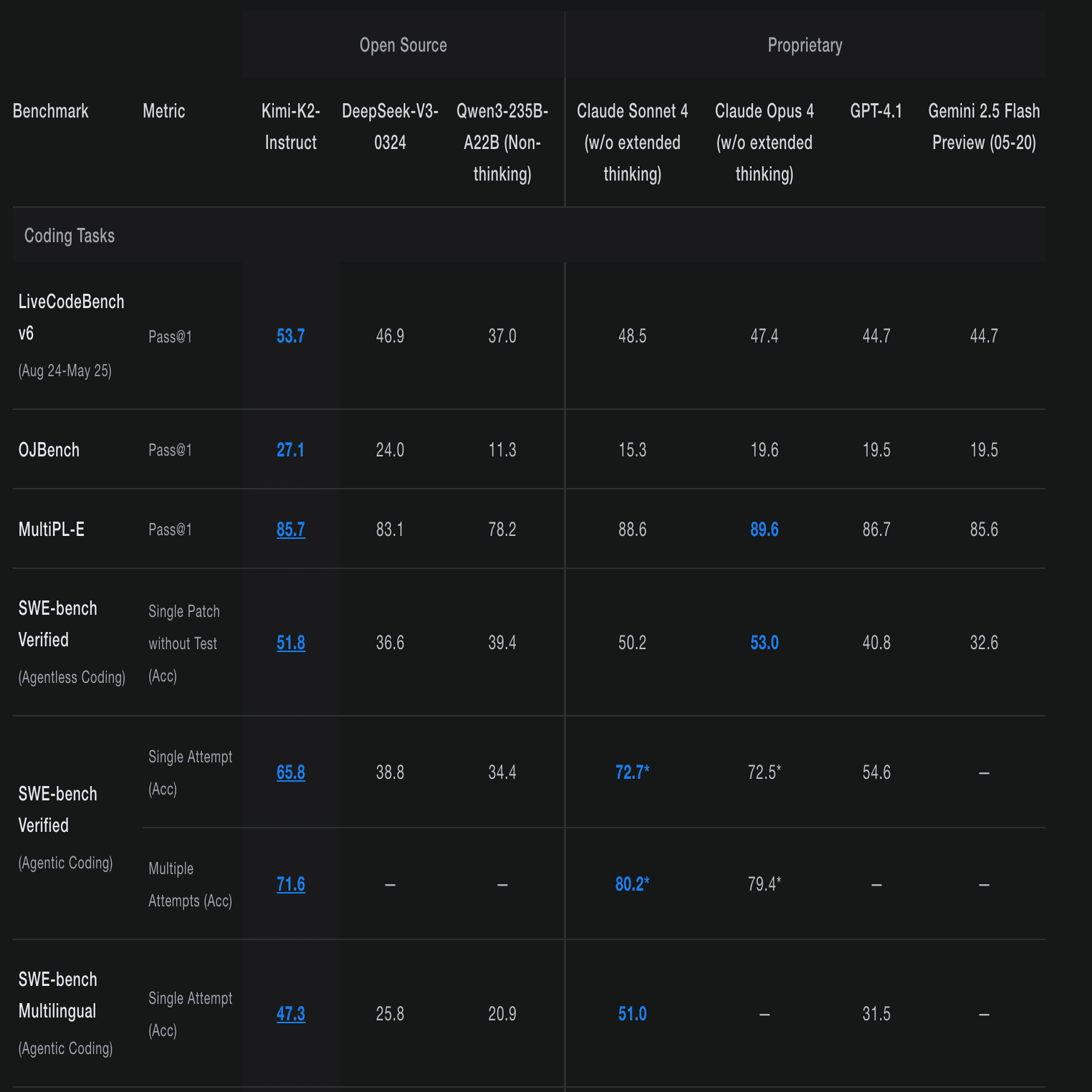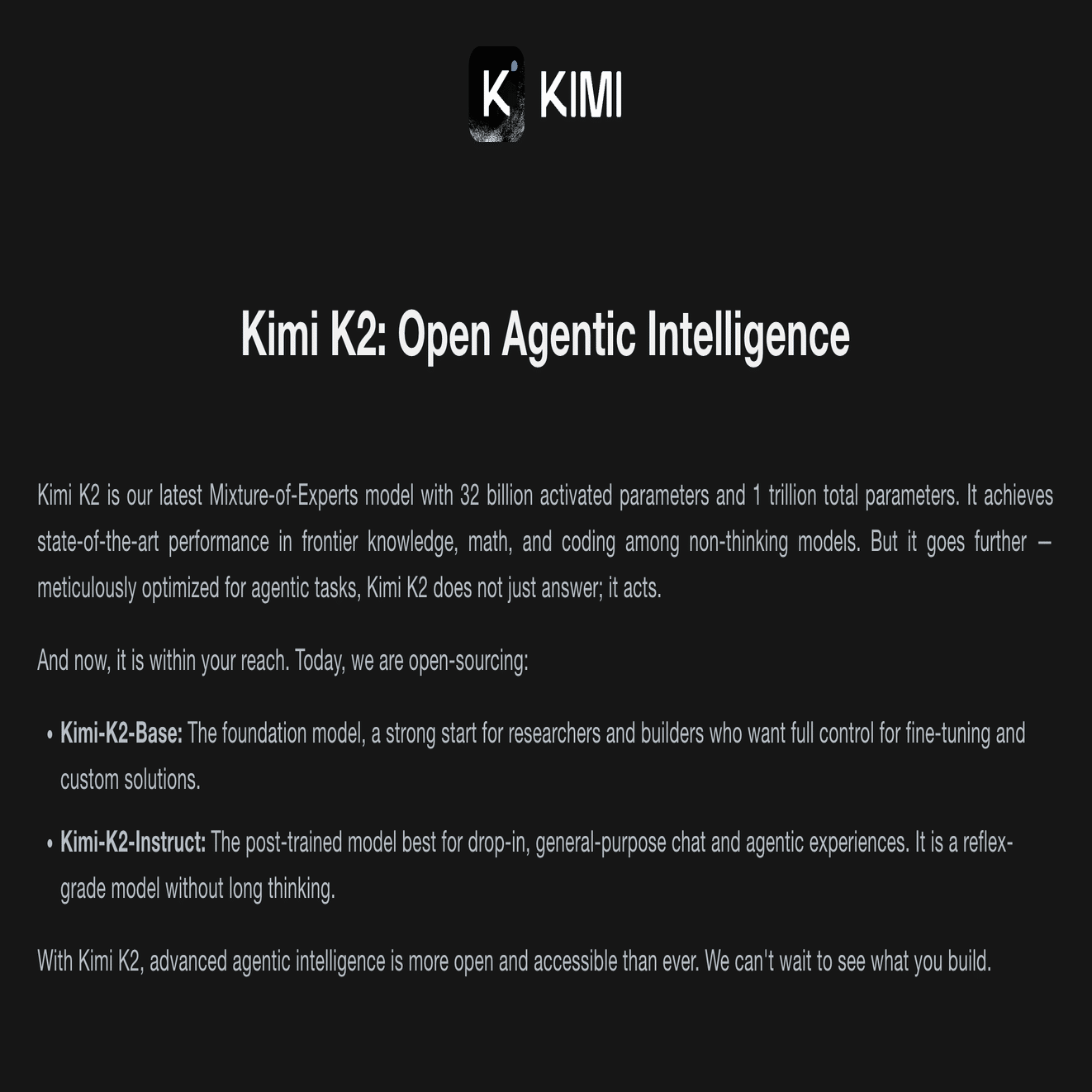 オープンソースなので、誰でもモデルのデータをダウンロードして利用できます。研究向けの「Kimi-K2-Base」と、対話や指示が得意な「Kimi-K2-Instruct」の2種類が公開されてます。