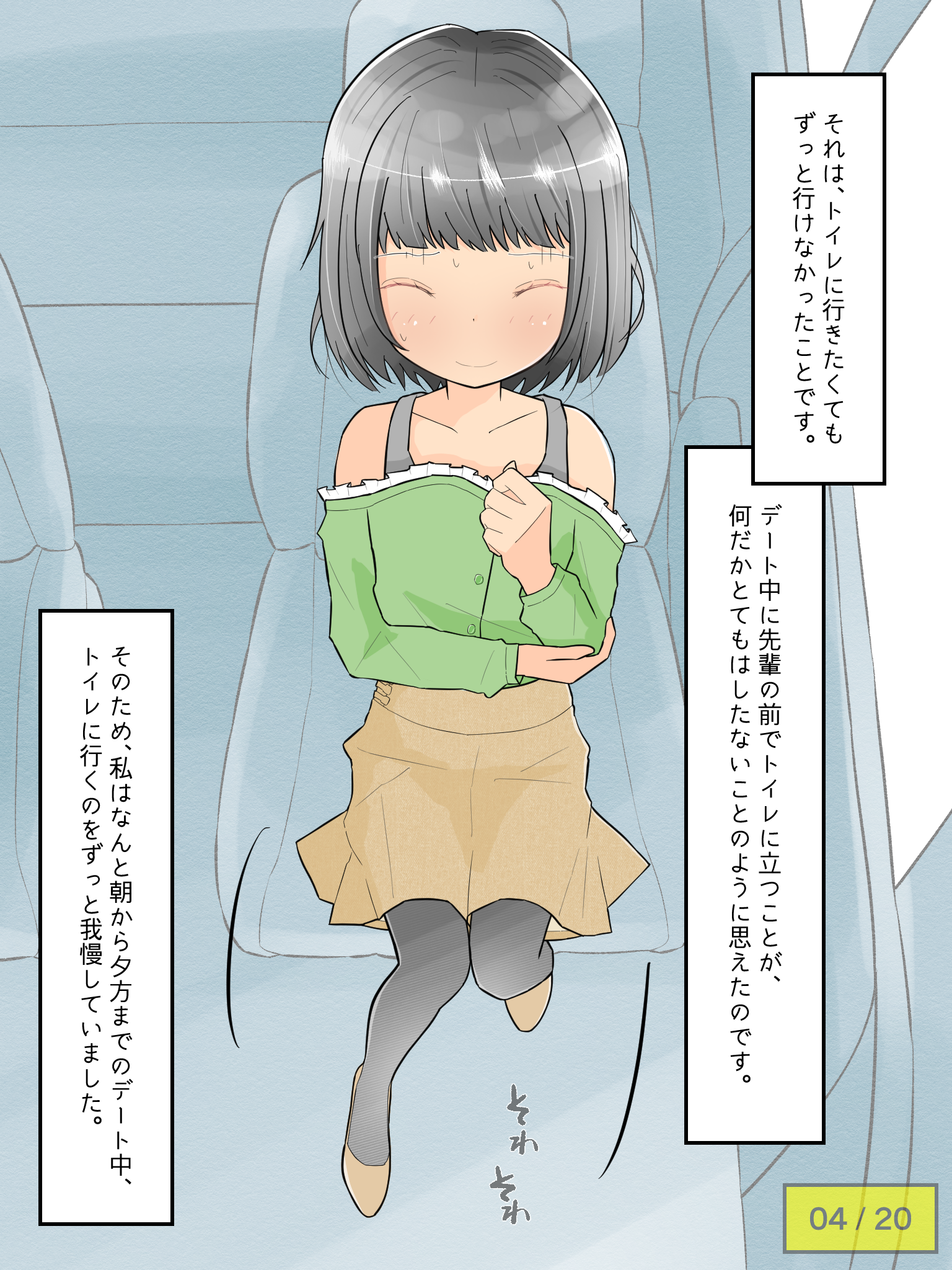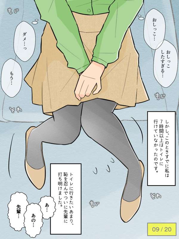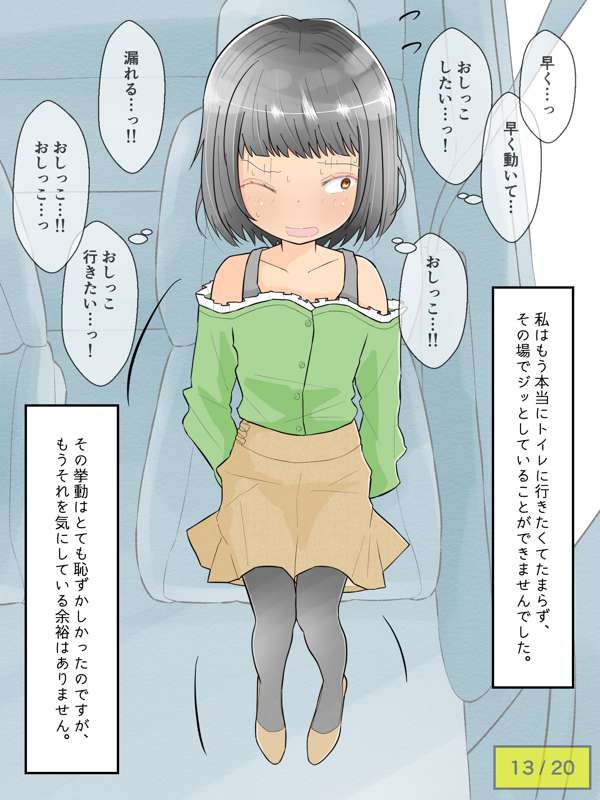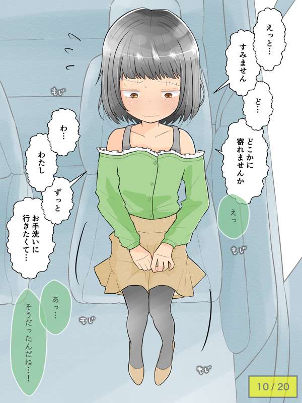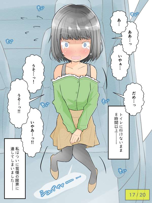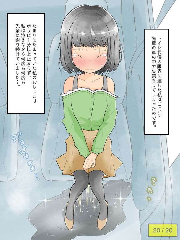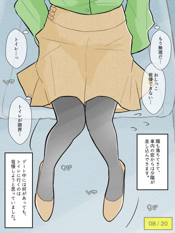 先輩の車でドライブを楽しむも、気恥ずかしさからずっとトイレを我慢し続けてしまう彼女。