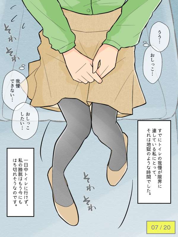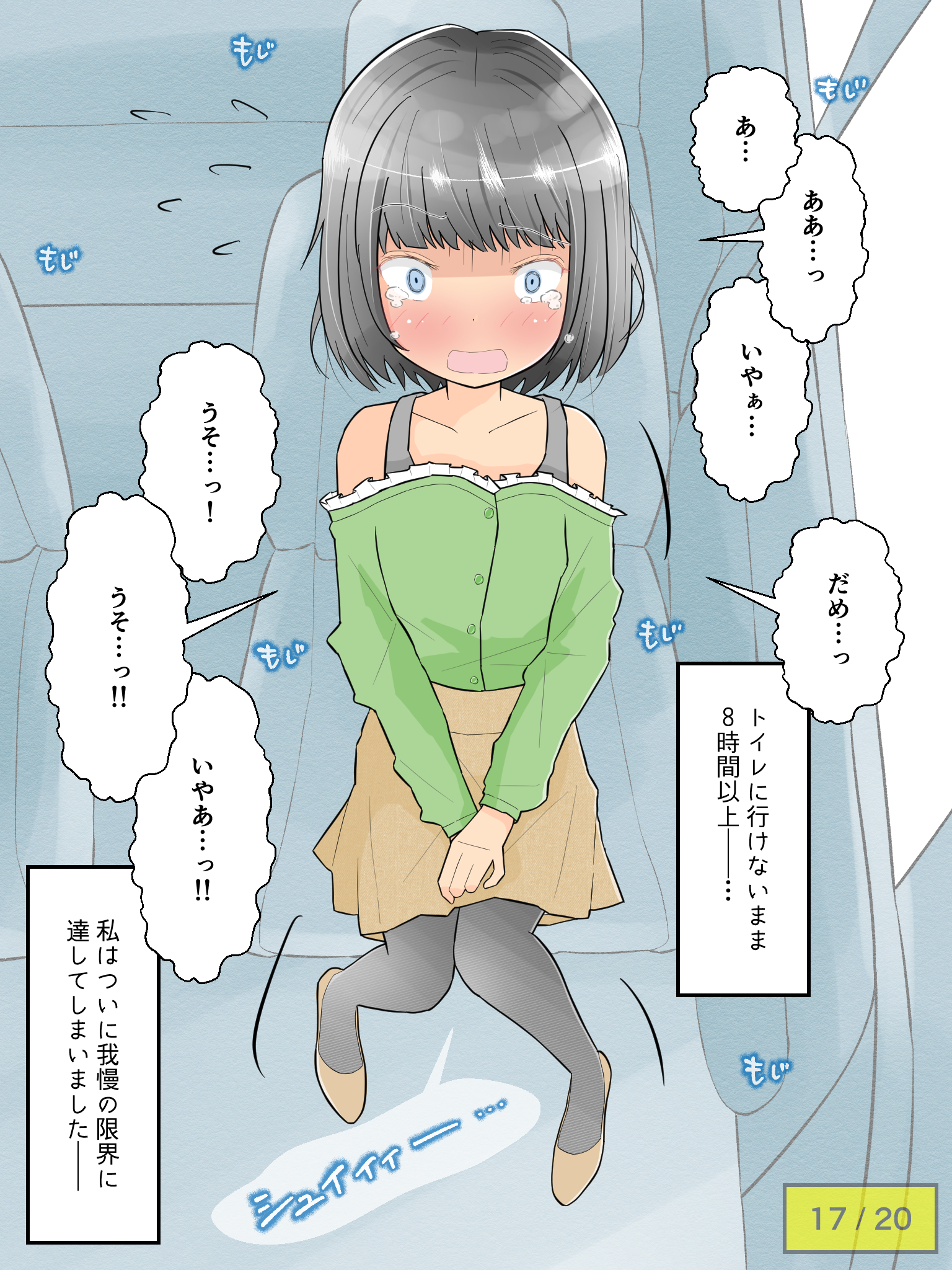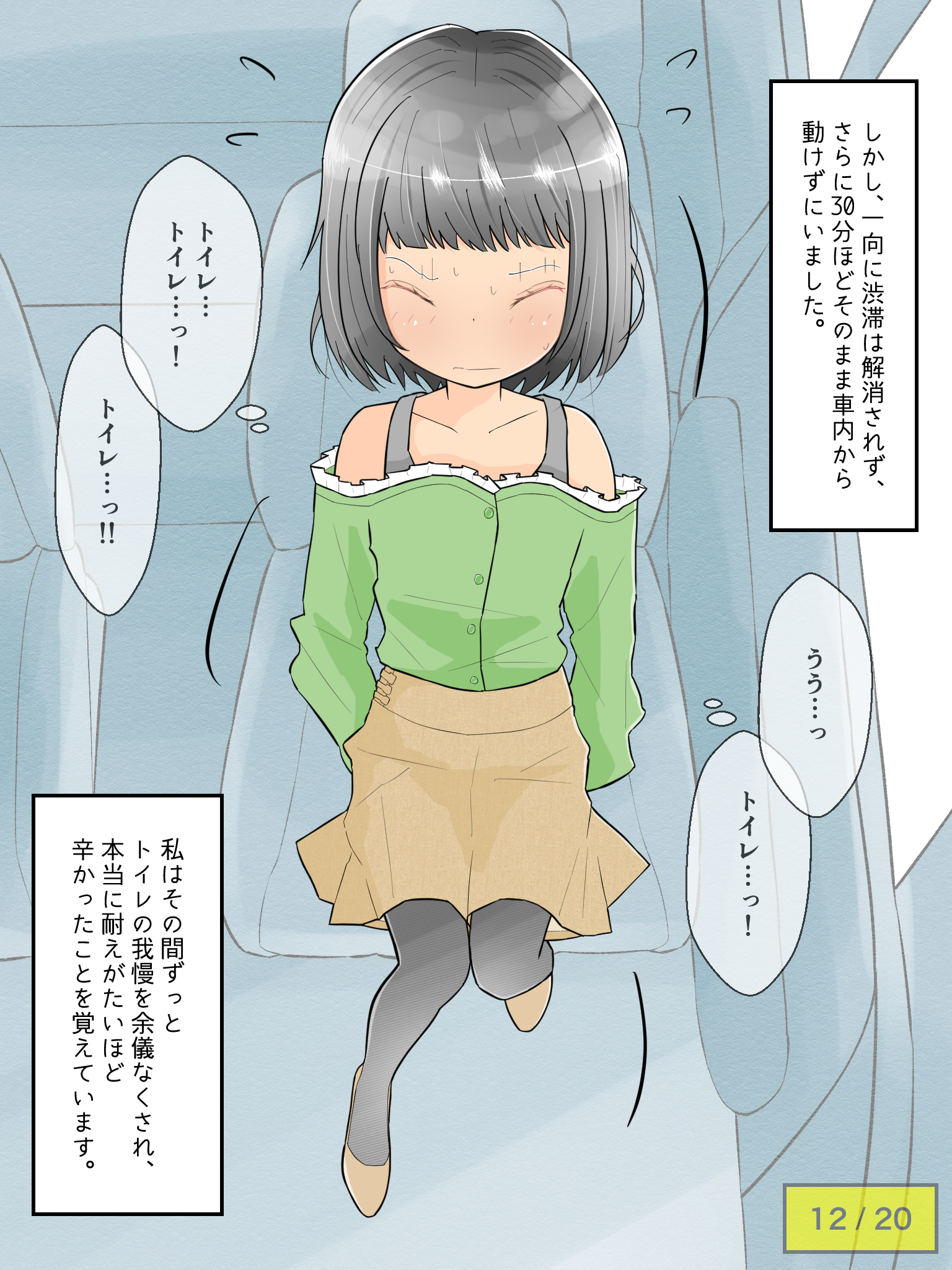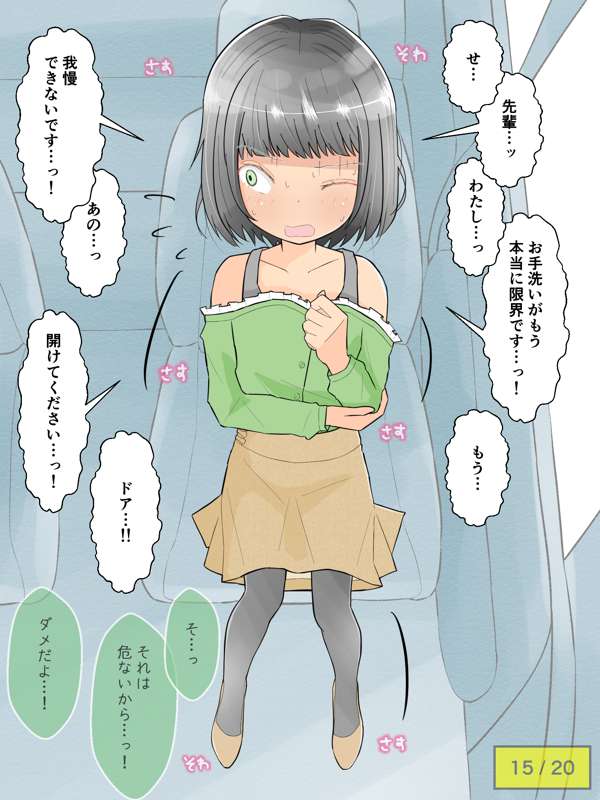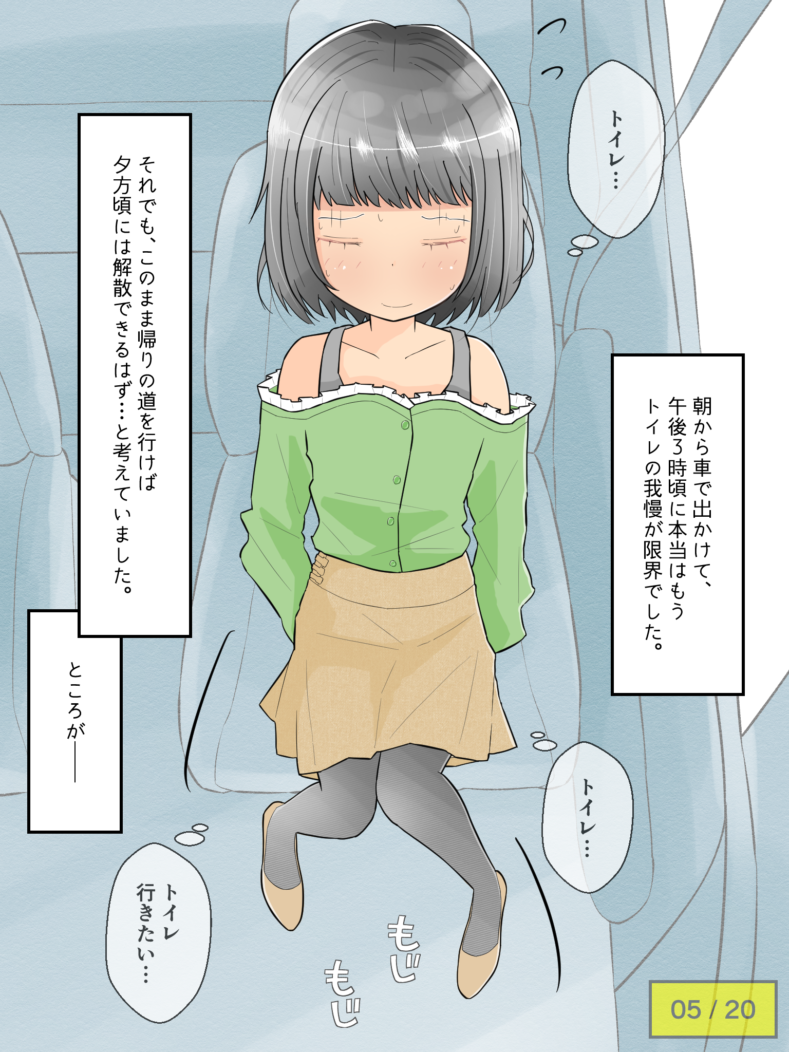 先輩の車でドライブを楽しむも、気恥ずかしさからずっとトイレを我慢し続けてしまう彼女。